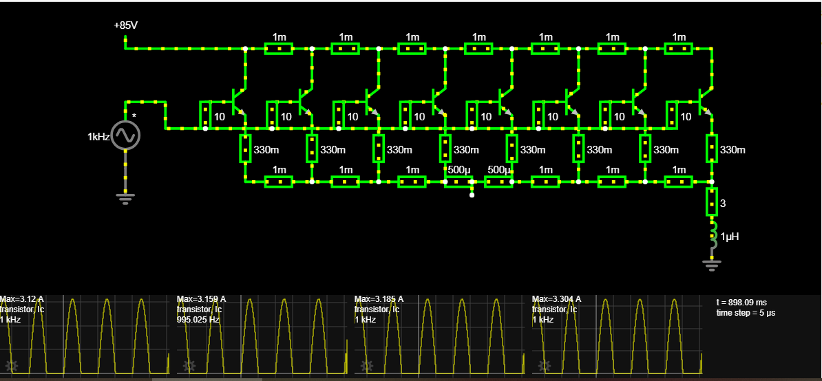 Itt szigorúan csak az Ic-t vizsgálva, nekem ezek az eredmények jöttek ki. Ez 1oz, 10mm széles, 140mm hosszú vezetősávot feltételez a tápnál és a kimenetnél is, 20mm közökkel. A két szélső, illetve a két középső tranzisztor van a szkópokon. Ezek szerint a középső kimenetválasztás nagyon is jól jöhet. A Falstad nem túl okos, de az alapvető számolásokkal még elvan.