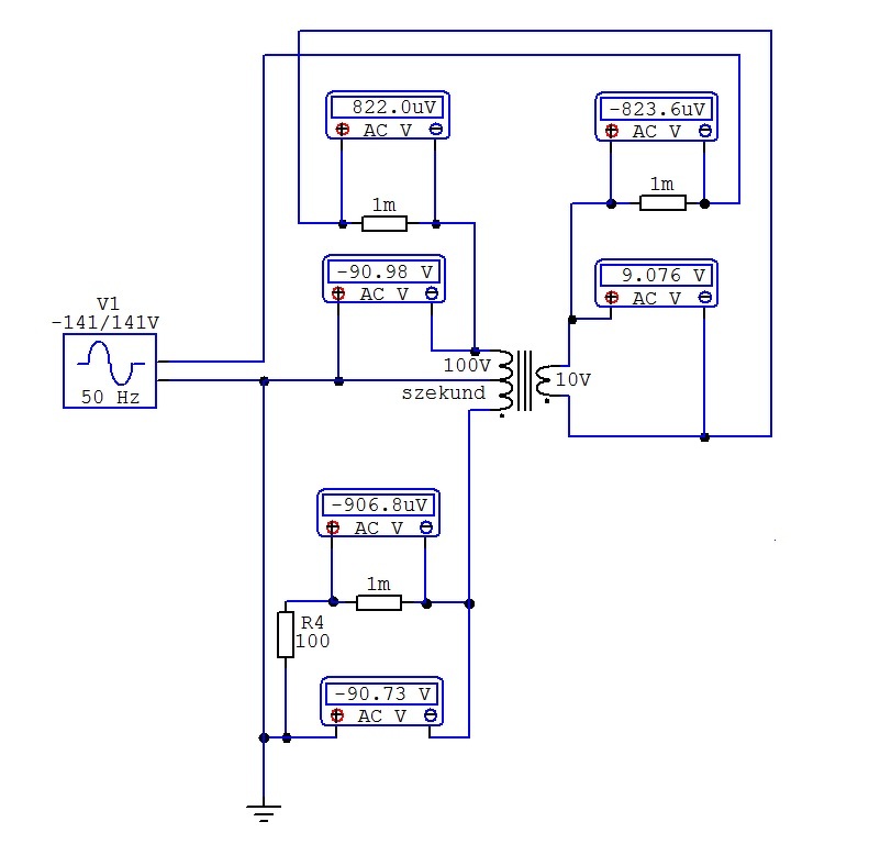 Egy 100 Ohmos ellenállást választottam a szekunder oldali terhelésnek. A primer és a szekunder 100V az középen össze van kapcsolva, de egyszerűen nincs a szimulátorban három független tekercsű trafó. A lényeg, itt van a szimuláció. A transzformátort nem lehet végtelen csatolásúvá tenni, csak 99,9%-osig. Ebből a mérési eltérés. A bemeneti feszültséget csúcsban kell megadnom, innen a 141,4V.