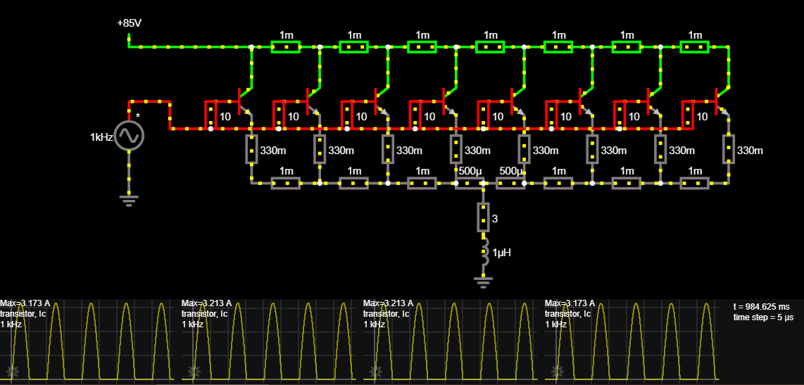 Itt szigorúan csak az Ic-t vizsgálva, nekem ezek az eredmények jöttek ki. Ez 1oz, 10mm széles, 140mm hosszú vezetősávot feltételez a tápnál és a kimenetnél is, 20mm közökkel. A két szélső, illetve a két középső tranzisztor van a szkópokon. Ezek szerint a középső kimenetválasztás nagyon is jól jöhet. A Falstad nem túl okos, de az alapvető számolásokkal még elvan.