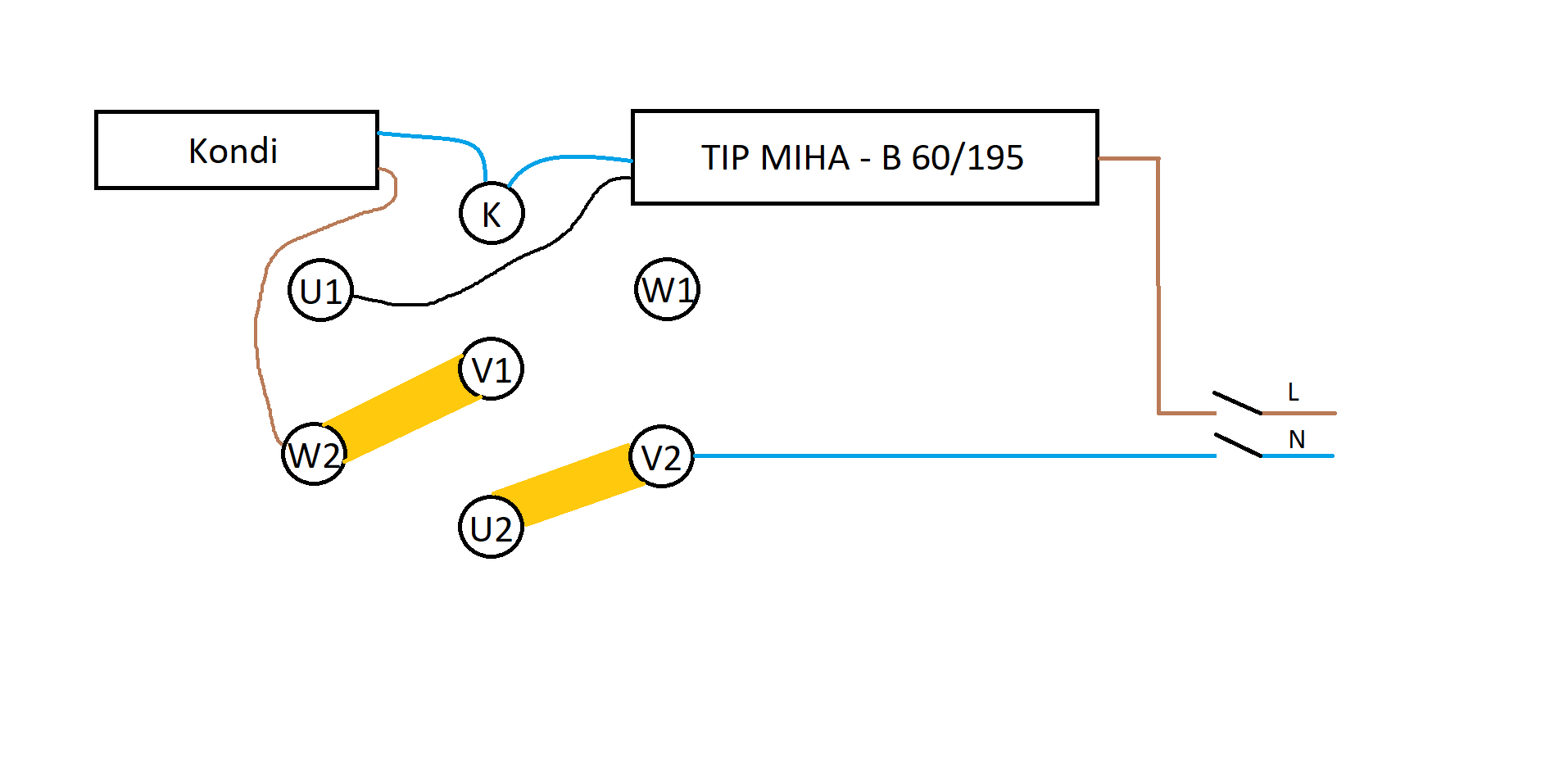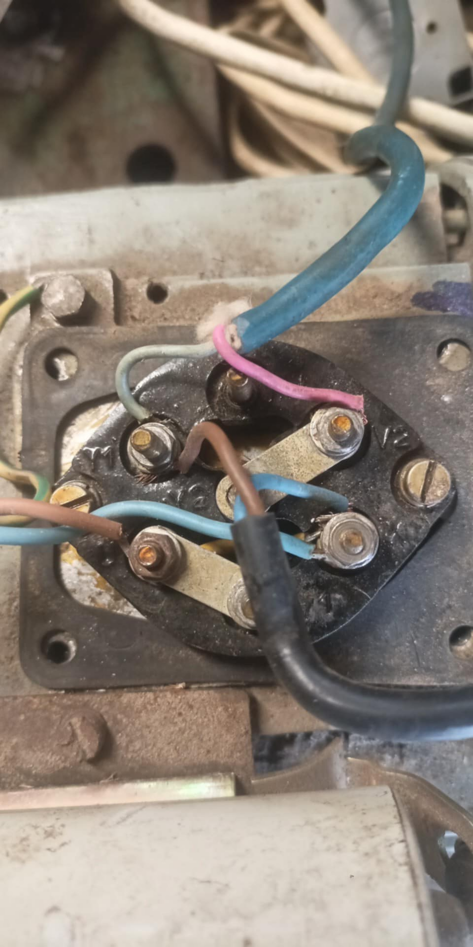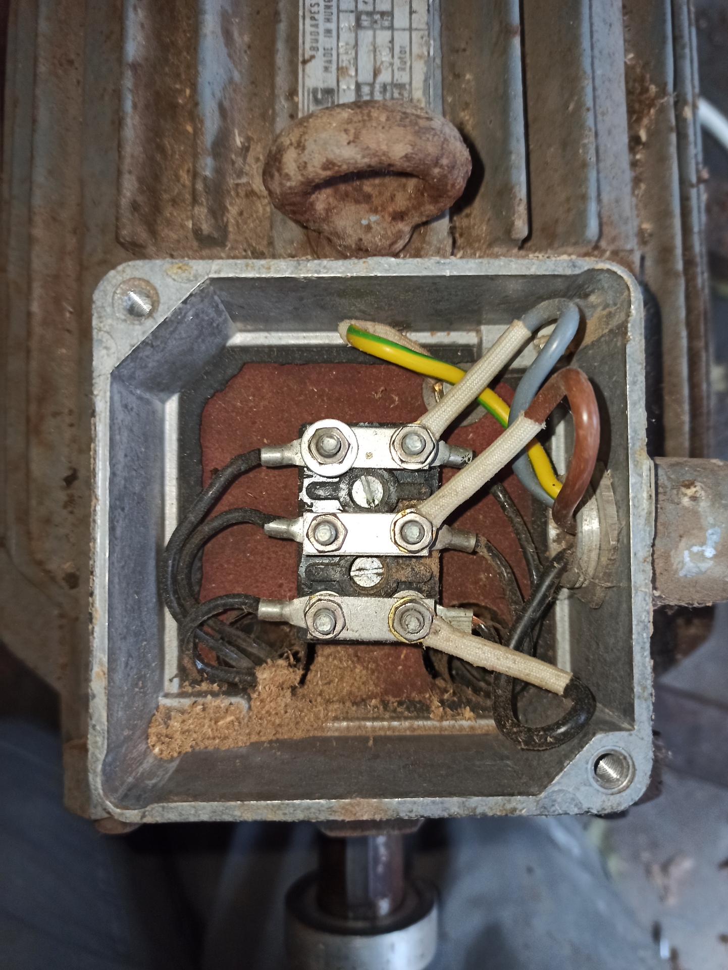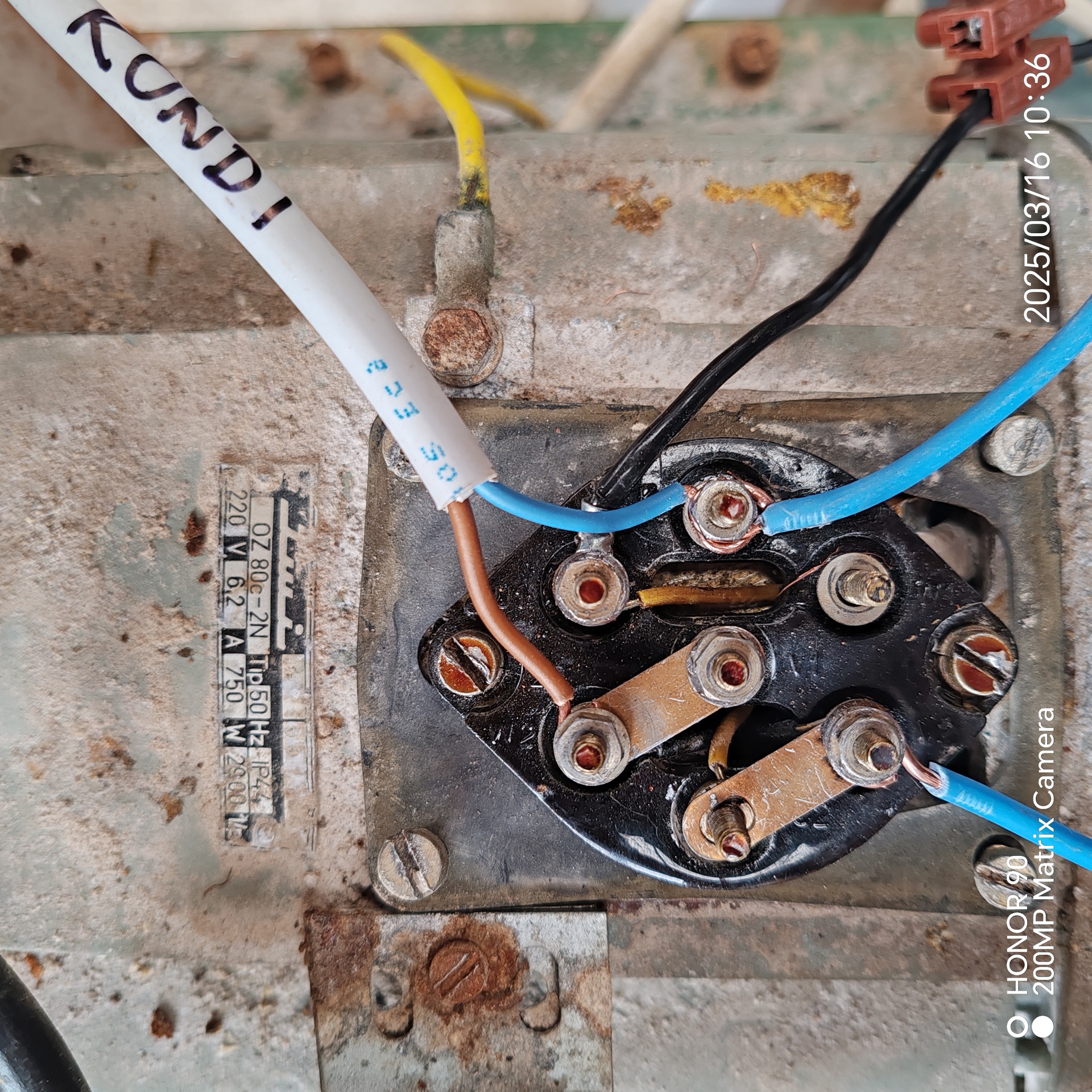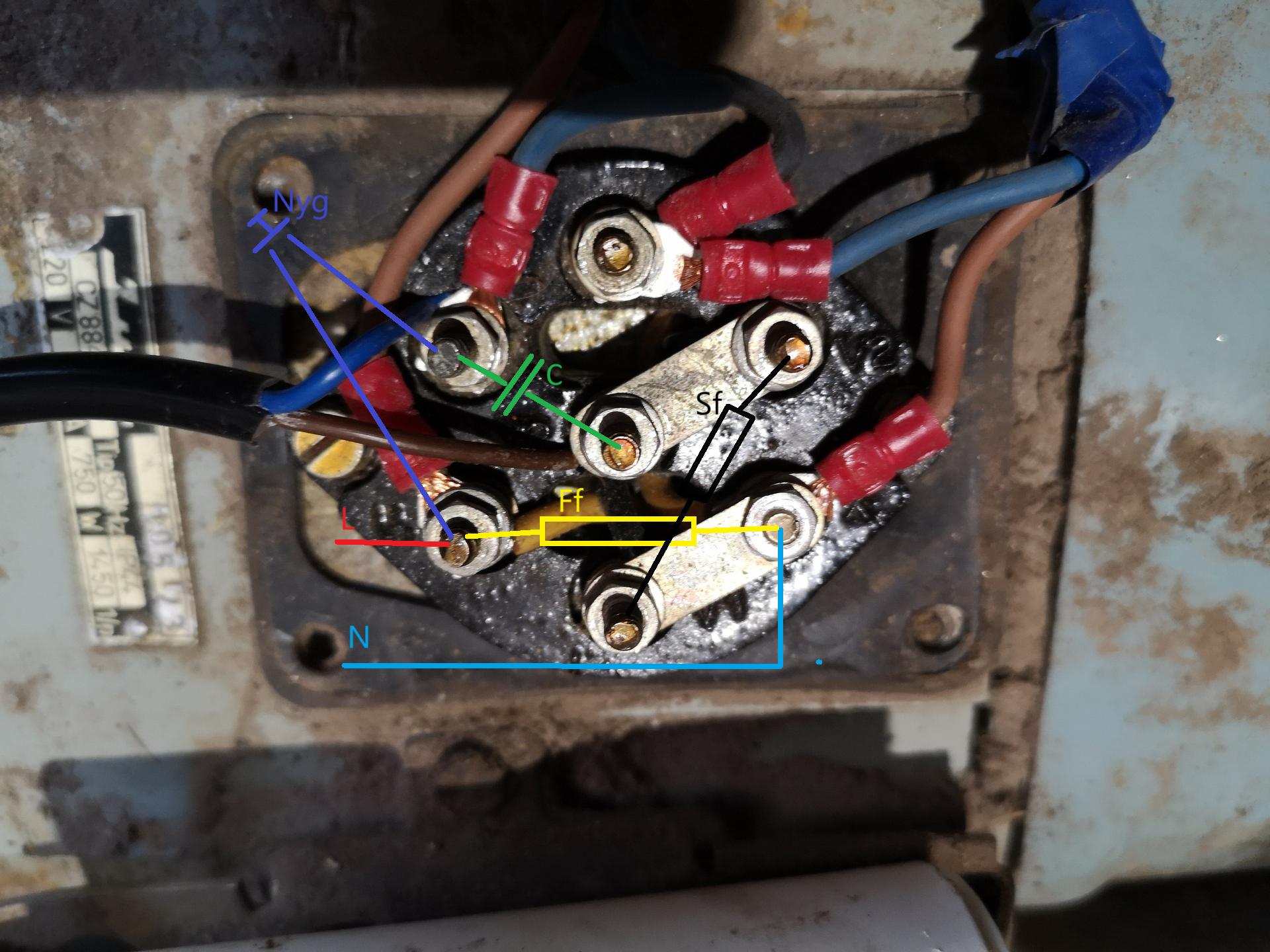 KD 160 terménydaráló villanymotor bekötéseSziasztok!Adott egy KD 160 terménydaráló, és a képeken szereplő IMI villanymotor hajtaná meg. Minden le volt kötve róla, és az itt találtak segítségével az alábbi módon kötöttem be. Viszont beüzemeléskor a motor nem pörög fel. Elindul, de csak lassan forog. Illetve kb. 10 másodperc után a nulla bekötési ponton füstölni kezdett... A kondi elvileg jó, próbáltam másikkal is, ugyan az az eredmény. A "relé" behúz-kapcsol amint áram alá kerül. (A képen szereplő kötések csak ideiglenesek, és megfelelő színnel és saruval lesznek ellátva, feltéve hogy sikerül életre kelteni ?)