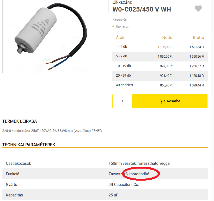 üzemi vagy indító kondenzátorSziasztok!25uf állandó üzemű kondit kell cserélnem egy motoron. Azt honnét lehet megállapítani hogy egy kondi állandó üzemet bír vagy csak motor indításnyi időt? ez például:Bővebben: Link