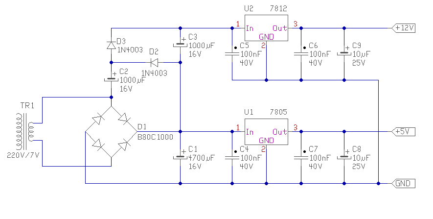 Egy kis segítség kellene nekem abban, hgy a labortápomon lesz stabil 12V és stabil 5V ezt mindkettőt egy stab IC-vel szeretném megoldani egy trafóról. Ezt úgy terveztem megvalósítani, hogy van egy 7V-os trafóm ez hagyományos Gratz-es egyenirányítással puffereléssel 9.8V ez sztem a 7805-nek megfelel A problémám a 7812-vel van találtam egy fesz kétszerezős egyxenirányítást mellékelem ez megfelelne a 7812nek? segítséget előre is kösz