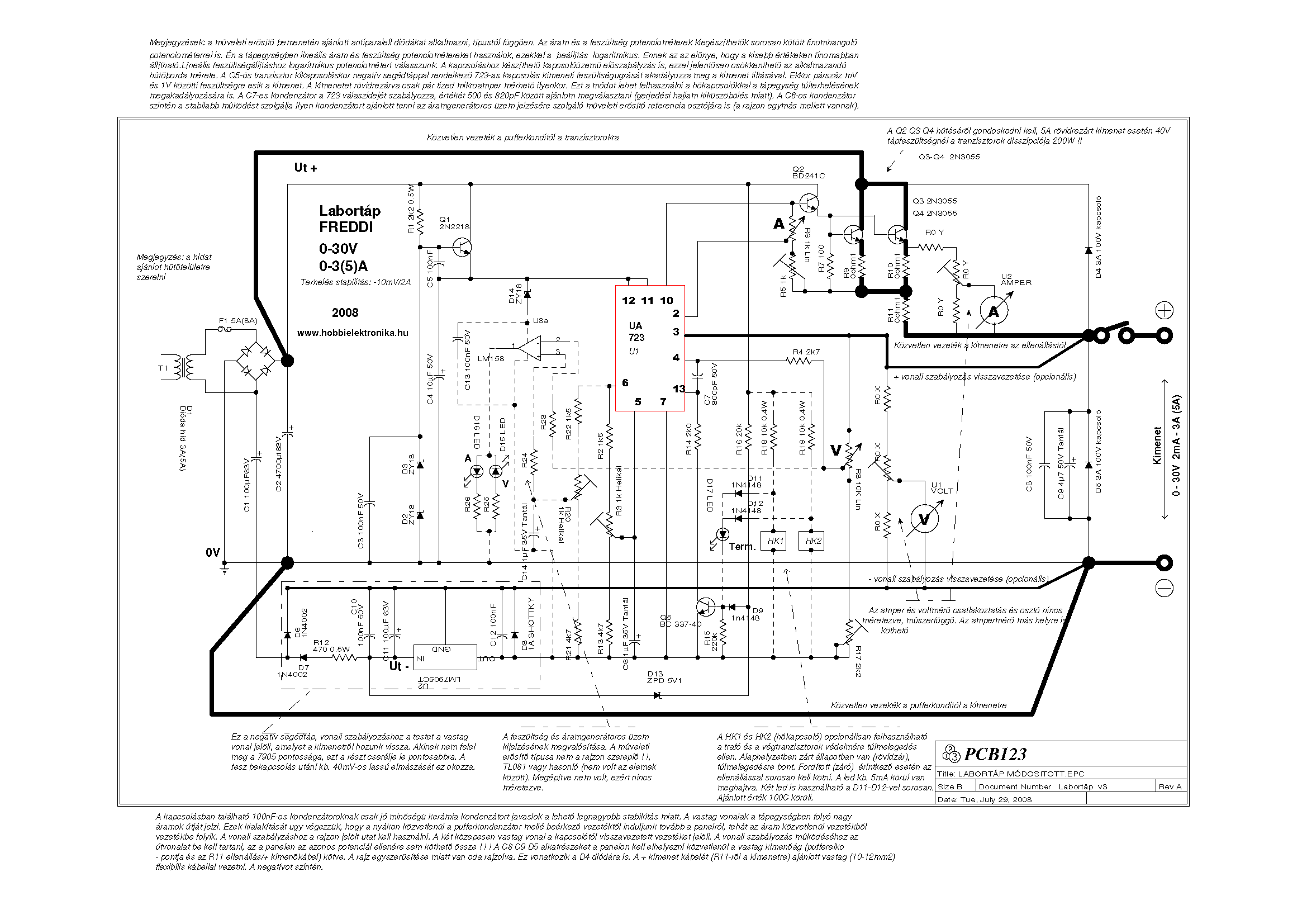 Készül a tápom. Viszont lenne egy kis bibi. Freddi tápjában a 723-as IC után meghajtónak egy BD241-es van berakva. Ezért én is azt raktam be, de így nem megy a feszültség 12V-nál feljebb. ideiglenesen beraktam egy BC547-es tranyót és azzal jól megy, de nem fogja bírni meghajtani a 2db 3055-os végtranyót. Miért nem bírja meghajtani a 723-as a BD-t? Elvileg meg kellene hajtania, de gyakorlatban nem megy.