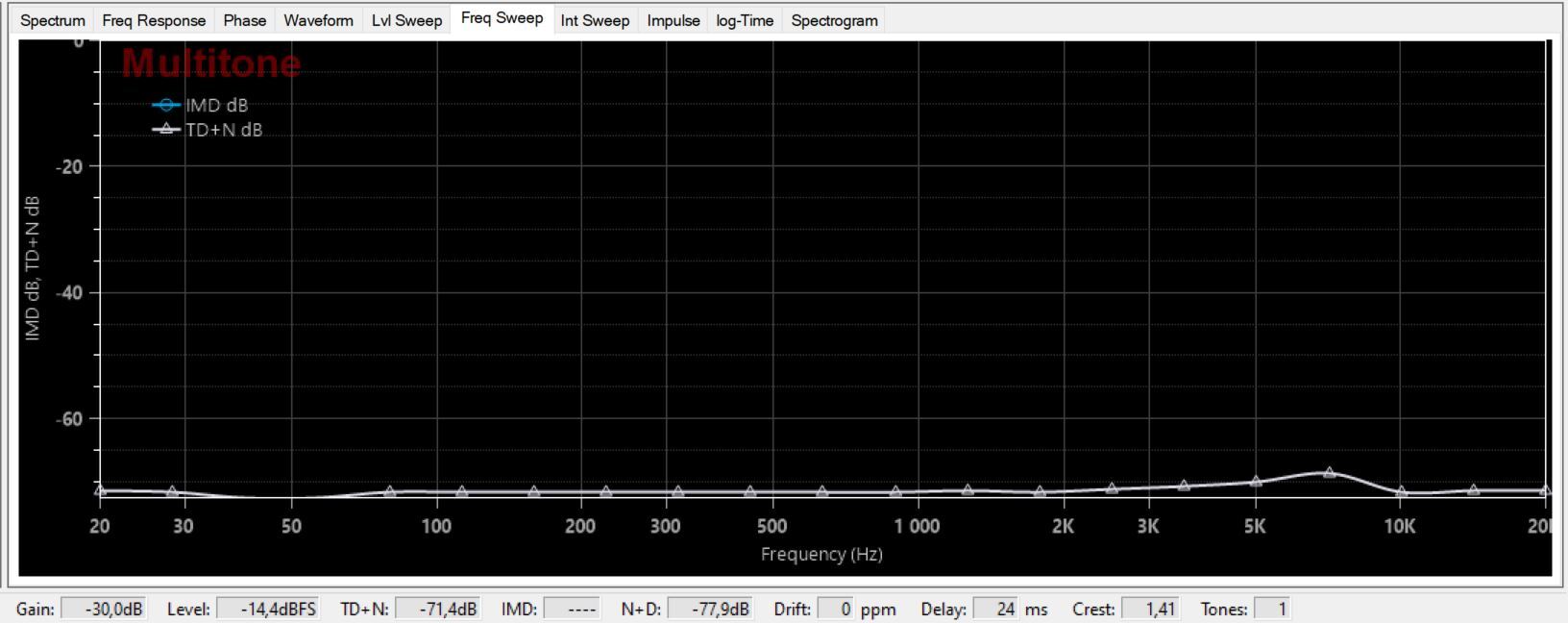 Csináltam egy 1kHz-s mérést is, ahol kihagytam a 400hz alatti frekiket, mivel ott tápszűrési gondjaim vannak. így azért nem rossz. 0,002% THD @ 1Khz. IMD 0,011% A hozzászólás módosítva: Márc 16, 2025
