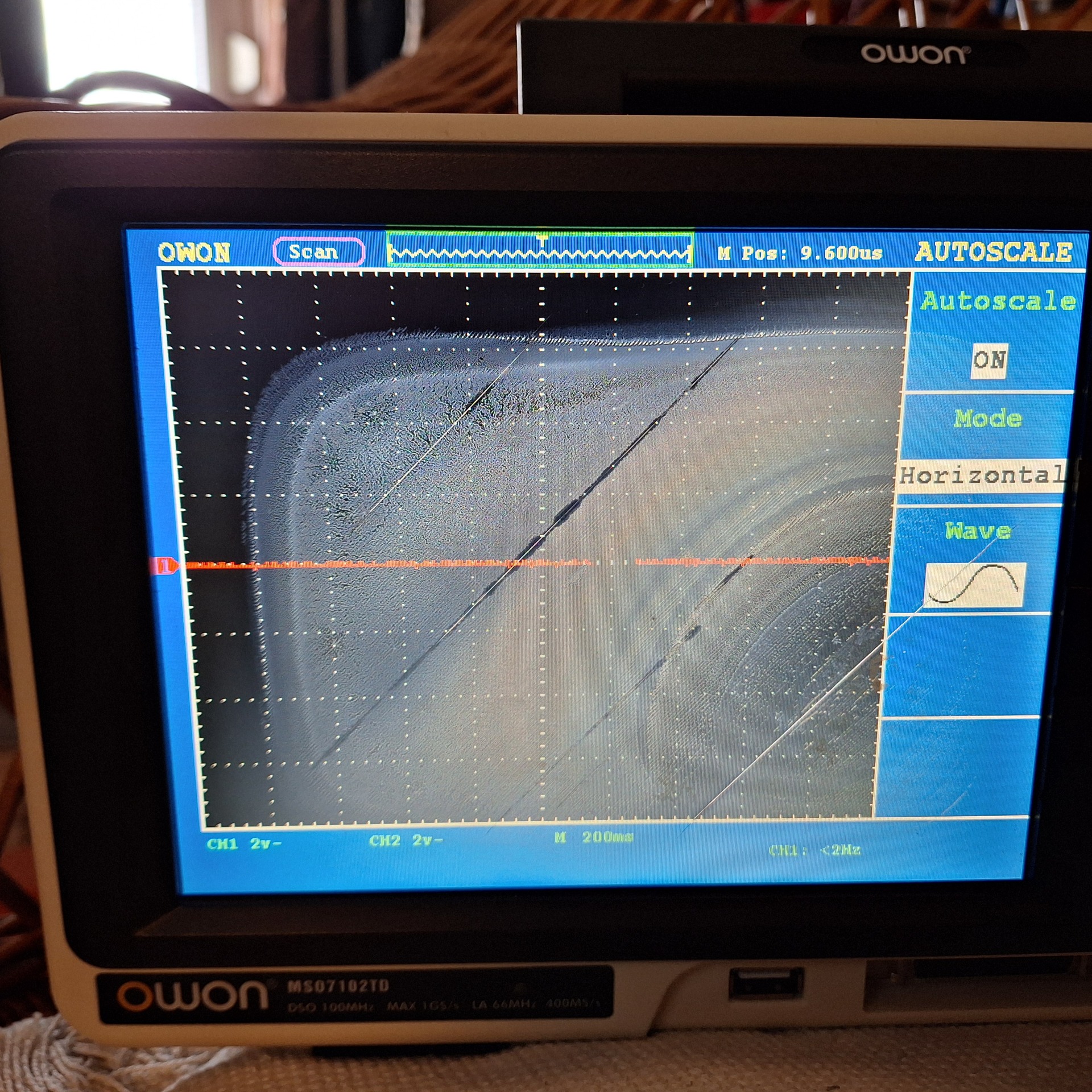 Ne hagyd így működni sokáig, mert beég a képernyő. Az első szkópom ugyanezzel a csővel ment. Kb 2 év alatt beégett a nullavonal, szóval ha épp nem használod, kapcsold ki.