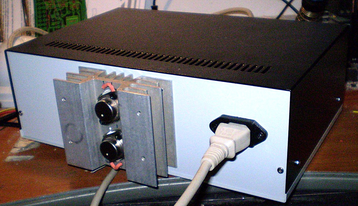 Egyébként egy-két szösszenet (ha nem untatok senkit...) A legnagyobb meló a kijelzők "bereszelése" volt, hogy szépen illeszkedjenek-illesztő keret hiányában. A másik meg a hálózati trafó megtekercselése. Véresre vágta a kezemet a drót. Nem is gondoltam volna, hogy a vastag vezeték ilyen sprőd... Két dolgot tartottam fontosnak: Ne látszódjanak az előlapon a felfogatások (csavarok-anyák) és, hogy gusztusos legyen az elrendezés. Az is sokat nyomott a latba, hogy a lehető legkisebb legyen a doboz... Ami nagyon tettszik: az aktív ki-be kapcsoló és a hővédelem. Köszönet Norbertonak és mikloschnak a segítségért!