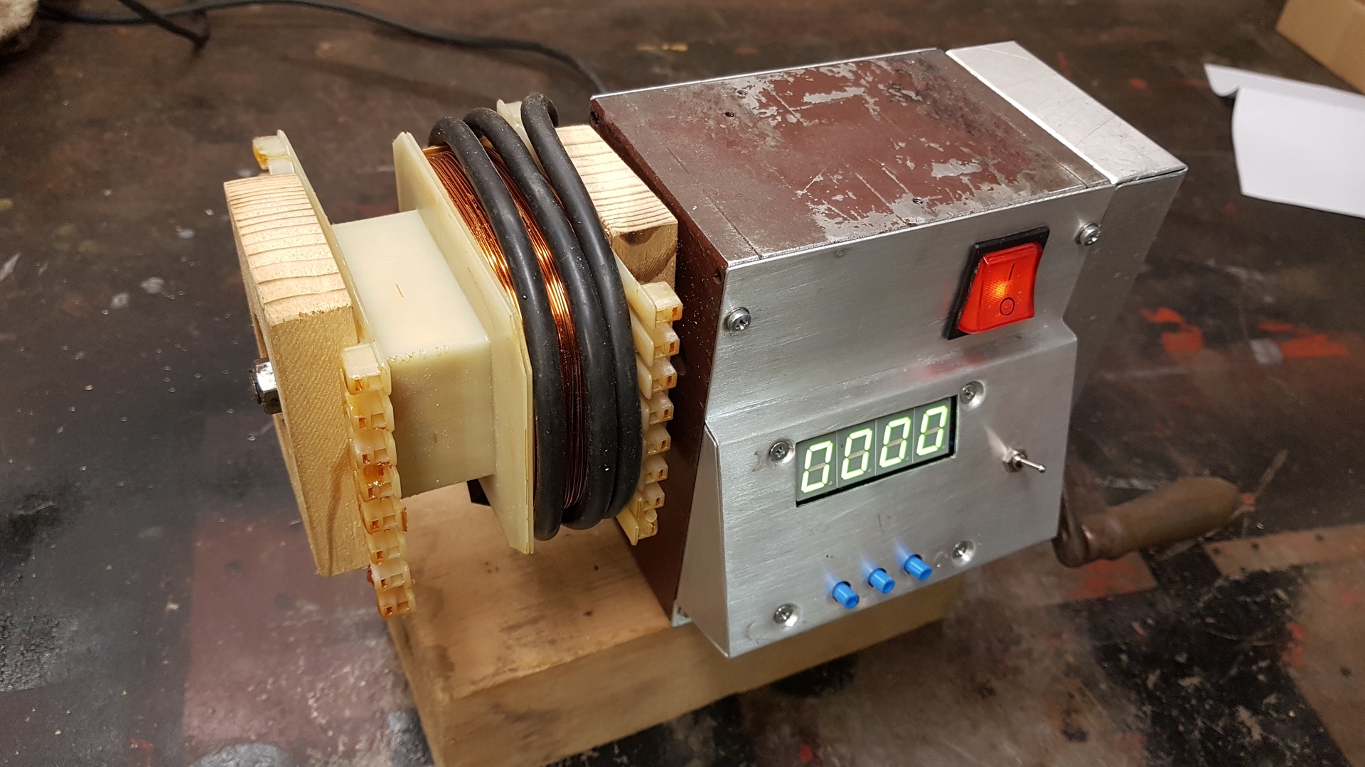 A első lépés a meglévő trafó szétszedése volt, ami annak hegesztéssel való zárása miatt nem volt egyszerű. Aztán lebontottam a szekundert, pontosan számolva a meneteket, mert így meg tudtam határozni a voltonkénti menetszámot. Majd következett egy nagyon hosszú szünet, mert valójában nincs szükségem a trafóra.