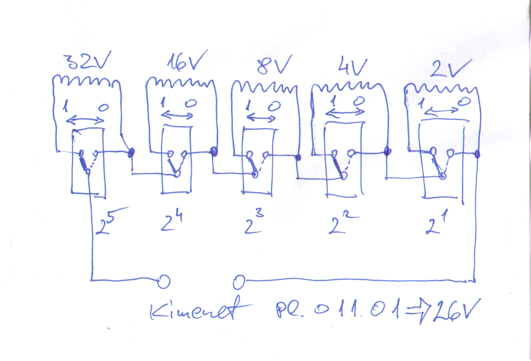 Még mindig a könnyen használható, jól áttekinthető előlapon töprengek a bináris feszültségértékek kihasználására. Ezért felmerült egy kötésmentes, kapcsolósort használó lehetőség is. Ehhez mindkét értéksorhoz kell 5-5 db 1 morzés kapcsoló, amik elbírják a tervezett 4 A körüli áramot (ilyet lehet találni többféle konstrukcióval). A melléklet szerint bekötve, szó szerint binárissá válik a kimeneti feszültség beállítása, mert a keresett érték bináris kódját kell beállítani a kapcsolókon. (Tudom, hiányzik az első helyi-érték, a 2 a nulladikon = 1 V, de ez eleve nem volt része a tervnek, elég a 2 V-os pontosság.)