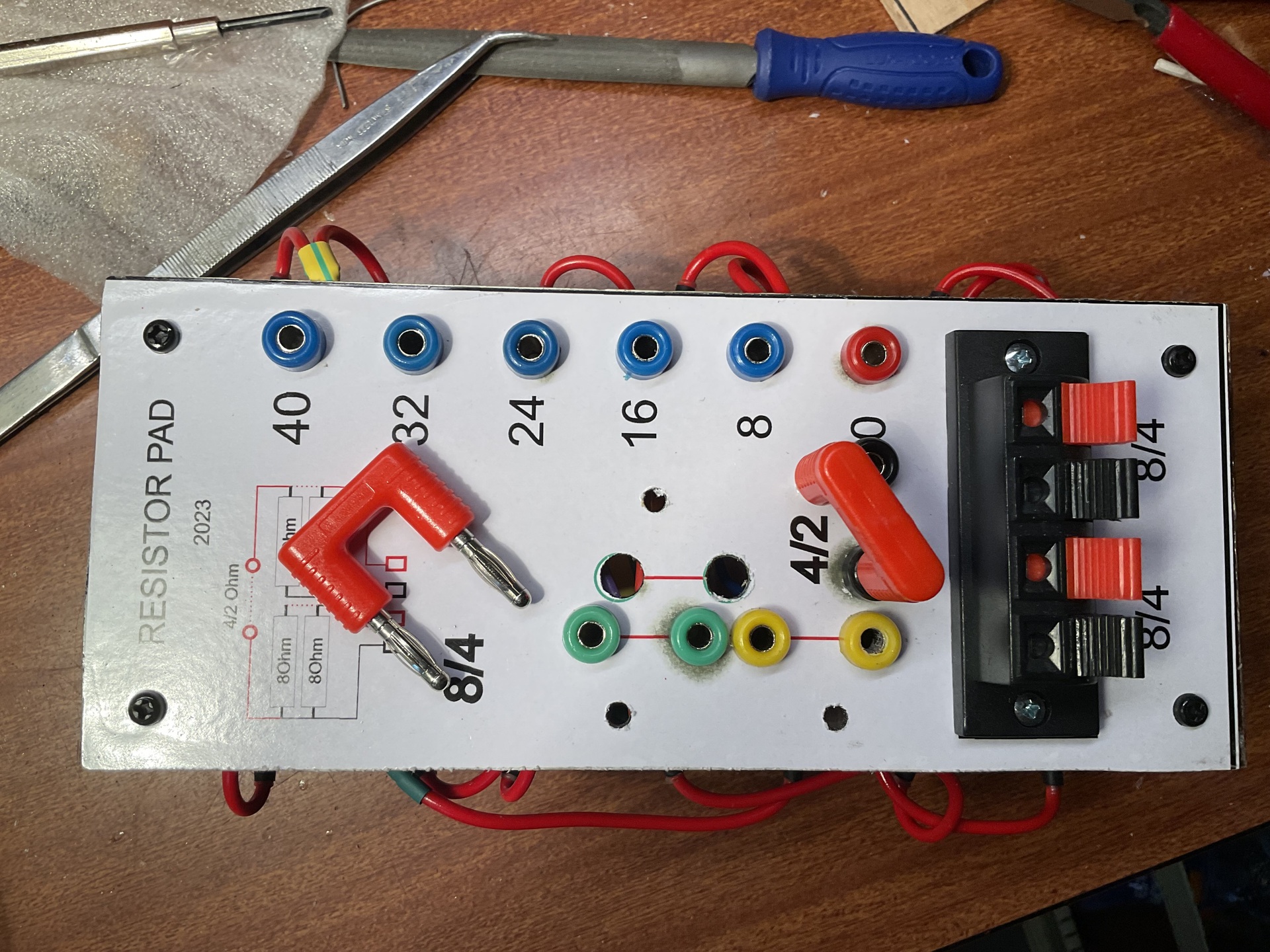 A képen láthatok hova lehet a hidat bedugni, és kialakitani a végleges ellenállást. Pofon egyszerü és olcso megoldás. A banánhüvelyeket csak ugy kell elhelyezni, hogy a hidakat másképp ne lehessen bedugni. Az én esetemben vannak meddö lyukak is ( azaz nincs kontaktus) csupán azért, hogy a használatlan hidak is ott maradjanak a panelon, s ne hentergejenek valahol a mühelyben..