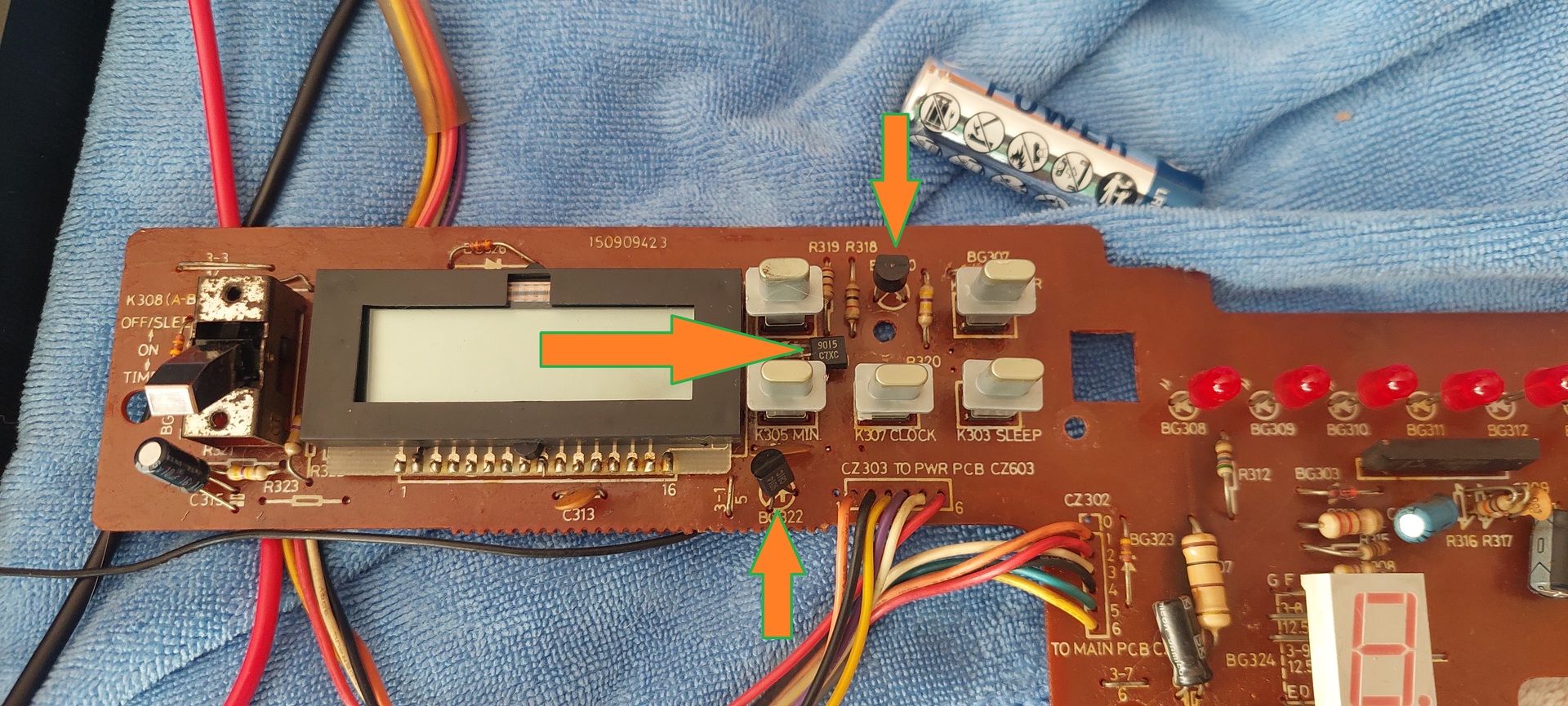 Az órát nézegetem. Próbáltam kitalálni, hogy hova megy a 1,5Volt a panelre, de az a helyzet, hogy csalk a negatív fele megy rá, mert a plusz 1,5Volt a táp/végfok panelre megy és onnan szerintem valamelyik vezeték köteggel menne az óra áramkörére. Csak az az igazság, hogy szerintem valami leülteti a feszültséget és azért nem lehet sehol mérni. Nekem legalábbis nem igen akar sikerülni. A kb. egy hete betett ceruza elem is tök nullán van. Arra gondoltam, hogy kéne valami hibás alkatrész keresni. Kérdésem az lenne, hogy szerintetek a képen szereplő, gombok közelében elhelyezett 3db pici tranzisztorral lehet-e gond? Kidobjam belőle?