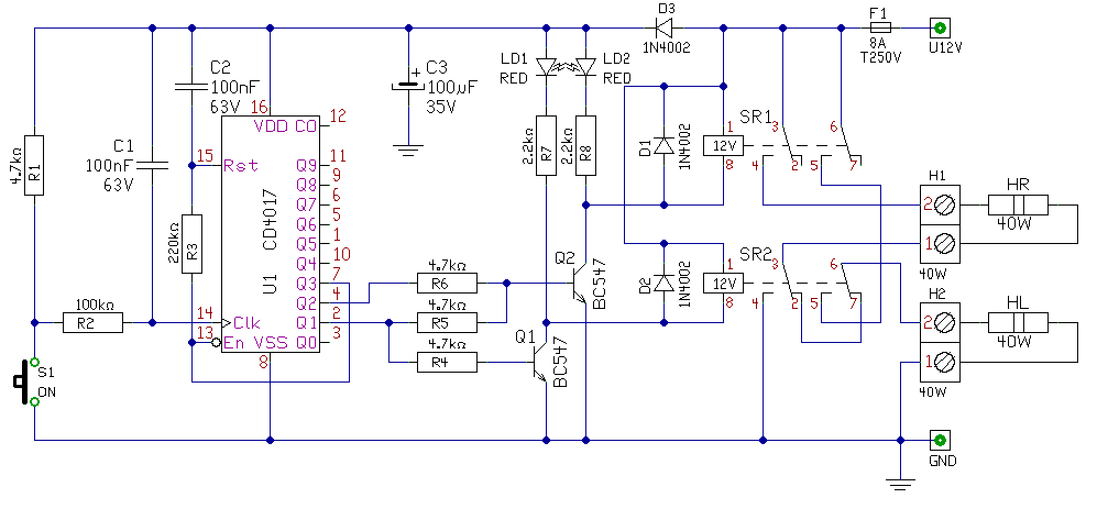 Nekem is a 4017 jutott eszembe elsőre. De lehet jobb lenne ha valami szabályozható (pl PWM) fűtést csinálnál. Ki kellene próbálni azok a fix fűtőteljesítmények mennyire sok/elég. Ugye az is kérdés menet közben mekkora hőelvonás keletkezik. A 40W ugye majd 4A 2V-on, a generátor bírja a "rendes" világítással/fogyasztással is ezt a plusz terhet?