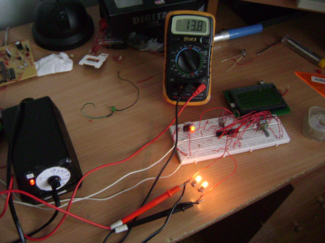 Az asztalon látható próba panelen egy feszültség mérő van(még fejlesztés alatt) mutatja a jelenlegi feszt, a munka közben mért legmagasabb feszt, és alul egy grafikonon jelzi a fesz változást. Sajna nem tud tizedet mutatni, csak 5V-os méréshatárnál, mert Mikropascalban írtam a progit, ami demo és csak 2Kb-ig enged progit írni