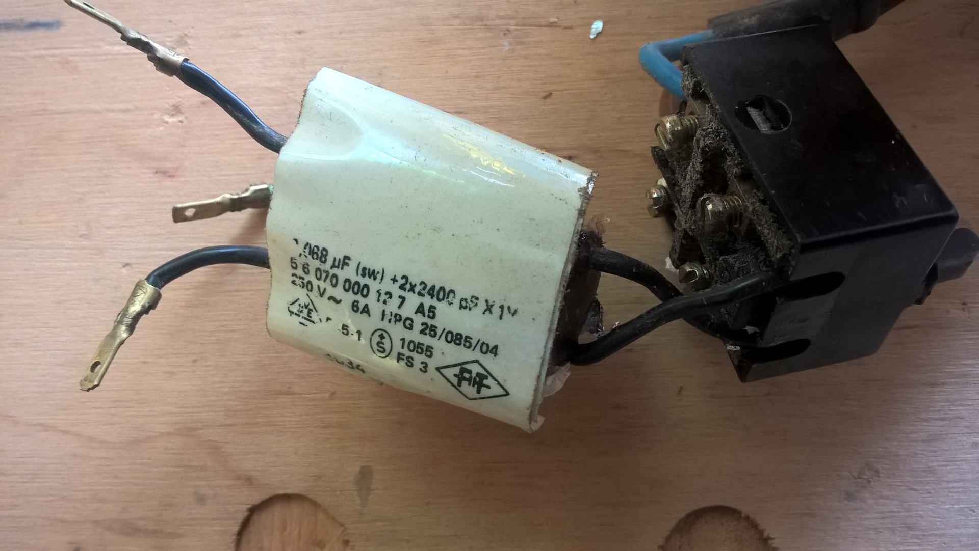Ez valójában nem egy, hanem 3db kondenzátor. 68nF class X a fázis és nulla között, és 2x 2,4nF class Y kondi a fázis-védőföld és nulla-védőföld között. (A zöld sárga vezető itt a motor fém részére volt kötve? A bejövő vezeték csak 2 eres.)