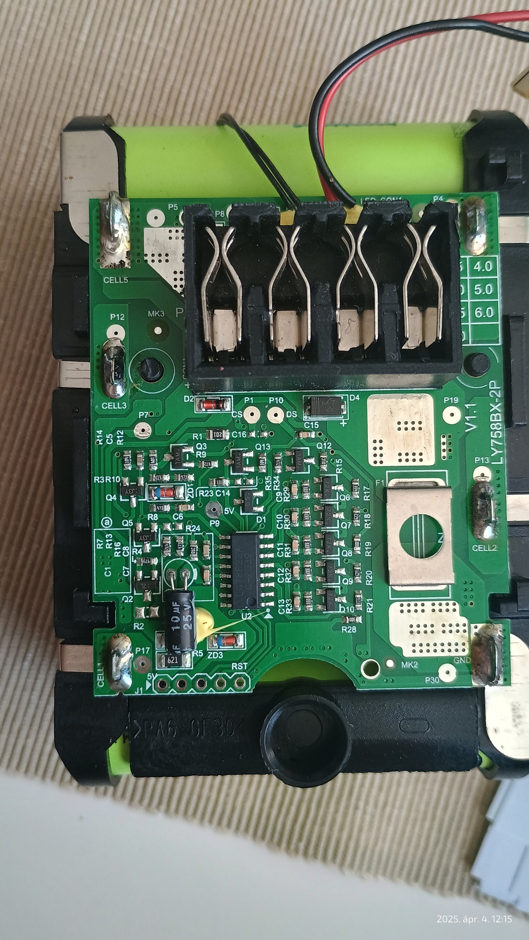 Hozzám került egy hibás Parkside 4 Ah akksi (ismerőstől).Sajnos címke nincs rajta, így pontos típust nem tudok, de nem BT-s. A jelenség: gépek szakaszosan mennek vele, kihagy, néha megy néha nem. Szétszedés, mérés után a helyzet: össz fesz. 16,7 V, két cella 2,8 V-os, a többi 3,6-3,8 V közötti. Töltőre téve szinte azonnal piros LED. A töltő típusa PLG 20 C1. Segítséget kérnék, mit mérjek, mit cseréljek? (Forrasztás megy)