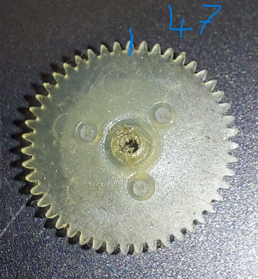 De van benne. Sőt! Valójában még vettem is. Csak ugye ez egy olyan fogaskerék, ami a kis tengelyre fel van pattintva. Egy horonyba pattan be a felső széle, ami picit szűkebb a furat lejjebb eső részénél. Nos, egyszer be van a horonyba pattintva és onnan nem akar kijönni. Persze lehúzom, csak utána már kicsit mozog a tengelyen. Pont annyit, hogy mellé tud kapni. De majd nekifutok még egyszer. Megpróbálom pici hasított alátéttel tögzíteni.