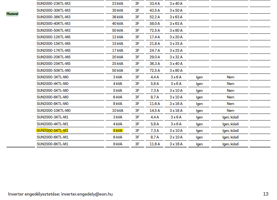 Szerintem nincs tűrés és százalék... törvényalkotásban amúgy sem jellemző. Az 500KVA kiserőművi határt is ki lehetett hozni 499kVA-re. De léteznek 99,99kVA-es és 29,9kVA-es inverterek is hasonló okból. Készre jelentés - Kivitelezői nyilatkozat: "Büntetőjogi felelősségem tudatában kijelentem, hogy a fenti felhasználási helyen a háztartási méretű kiserőmű kivitelezését az igénybejelentőben megadott adatoknak, az épületvillamos kiviteli dokumentációnak megfelelően a vonatkozó hatályban lévő jogszabályi és műszaki biztonsági követelményeknek megfelelően készítettem el." De a dokumentáció része a tervezői nyilatkozat is, csak érvényes jogosultsággal rendelkező tervező állíthatja össze a csatlakozási dokumentációt és nyújthatja be az áramszolgáltató felé. Elmű területen előbb kértek kamarai számot, mint az eonnál. Szerintem azt derítsd ki, hogy az eon miért 5kVA-esnek ismerte el ezt az invertert a minősített inverterek listájában. Lehet, hogy elfogadta a (látszólagos) teljesítmény szoftveres korlátozását? Vagy ezt mégis csak korlátozott ideig tudja kiadni magából az inverter, amit még eltűr a szolgáltató? Most nem emlékszem, hogy elő van-e írva hogy az inverter teljesítménytényezőjét kötelezően 1-re kell állítani, de ha így lenne, akkor viszont az adatlap alapján képtelen lesz 5000W-nál = 5000VA-nál többet kiadni magából. De a kötelező alapbeállítások között nincs teljesítménytényező. Ezt máshol kell keresni.