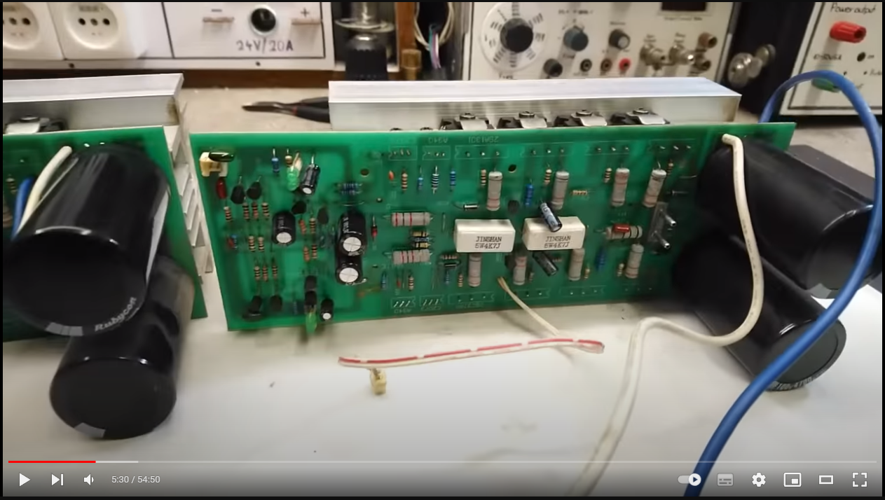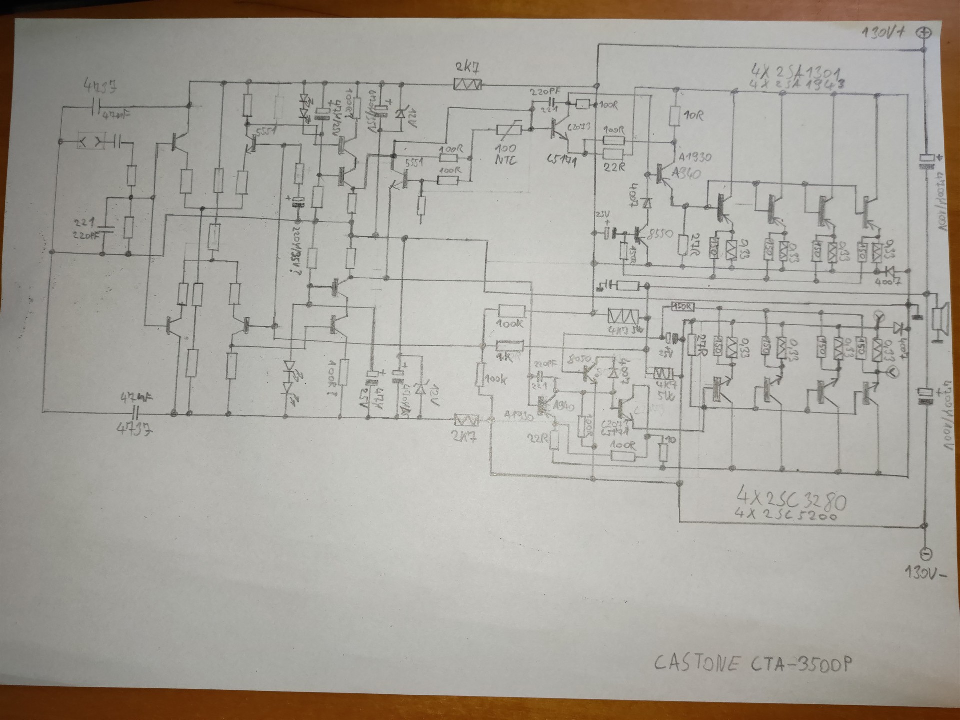 Ebbe a topicba már korábban írtam a Castone CTA-2500P illetve a CTA-3500P kapcsán, szerettem volna kapcsolási rajzot kérni vagy legalább két jó minőségű panelfotót. Nos most ott tartok, hogy egy videó alapján sikerült visszarajzolnom ami szerintem jól is sikerült. Viszont az alkatrészek értékei még kérdésesek és a tranzisztorok polaritásai. A nyákra írt tranzisztor típusok sem egyeznek azokkal amik be vannak építve, ez a nagyobb tranzisztoroknál még látszik is mint pl.: - Nyákra írt típusok: C2073, A940, 2SA1301, 2SC3280 - A beszerelt tranzisztorok: C5171, A1930, 2SA1943, 2SC5200. Vélhtően a nyákra írt kisebb tranzisztorok típusai is eltérnek a ténylegesen beépített típusoktól. Amely típusok a nyákon látszódnak a videóban azokat fel is tüntettem a visszarajzolt rajzon, ezek az alábbiak: 5551, 8550, 8050. Tudna valaki segíteni a pontos értékek beazonosításában illetve a kis tranzisztorok megfelelő típusának a megválasztásában? Megköszönném azt is, hogy ha a visszarajzolt rajz helyességét meg tudnátok erősíteni vagy hiba esetén korrigálni. Ezekről a Castone típusokról sajnos nem találni semmit a neten. A videó amely alapján visszarajzoltam itt található. Előre is köszönöm a segítséget!