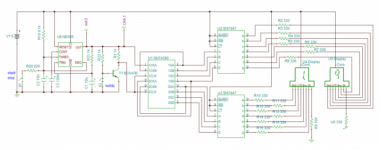 Úgy érzem ez neked nem fog menni , keress valakit a megtervezi neked . Nem kellenek a + kivezetések , adasz a bemenetre egy jelet és ameddig a jel jön a kijelző számol , a kimenetet rákötöd a következő digit bemenetére ennyi a történet . Tanulmányozd a 7490 adatlapját