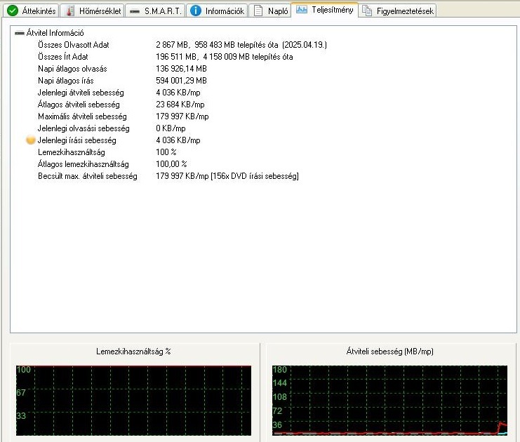 S.M.A.R.T. alapján nem mutat gondot az adatátviteli hibákon kívül. A 100%-os lemezkihasználtság viszont figyelemre méltó: valószínűleg instabil szektorokat cserél le a háttérben a tartalék területről és az miatt lassult le. A S.M.A.R.T. meg majd az újraindítása után fog ezzel frissülni.