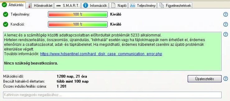 S.M.A.R.T. alapján nem mutat gondot az adatátviteli hibákon kívül. A 100%-os lemezkihasználtság viszont figyelemre méltó: valószínűleg instabil szektorokat cserél le a háttérben a tartalék területről és az miatt lassult le. A S.M.A.R.T. meg majd az újraindítása után fog ezzel frissülni.