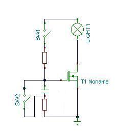 SW1 be : alapfényerő SW2 be :folyamatosan növekvő fényerő SW2 ki :folyamatosan csökkenő fényerő az alapfényerőig (a kondi kisül a 100K 1M párhuzamos tagon,esetleg még a felső tagon meg a tápon keresztül).