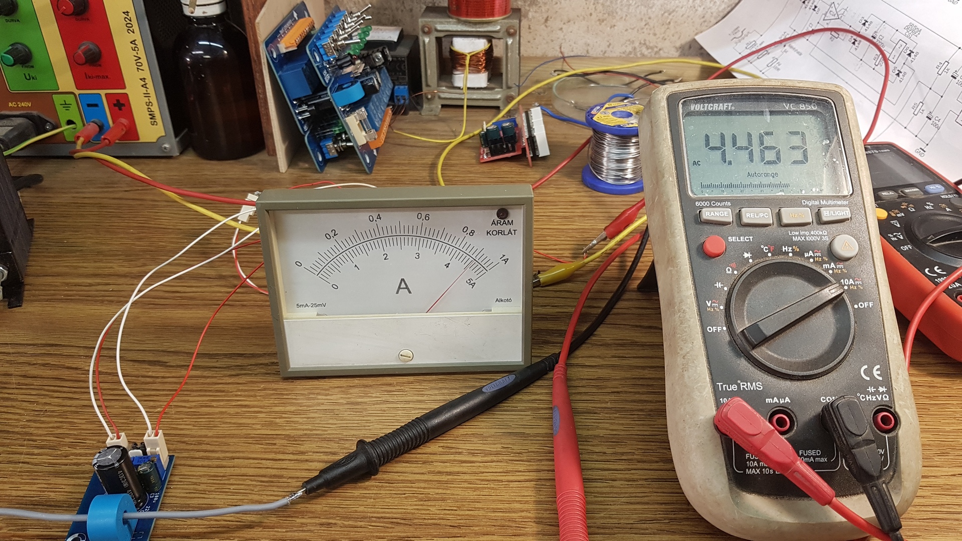Már eleve volt egy áramváltós mérési lehetőség a relé-panelen, ami maradéktalanul meg is hajt egy (akármilyen) digitális mérőegységet. De nekem a mutatós műszer birizgálta a fantáziámat, viszont ebből olyanom van, aminek nagyon kicsi az ellenállása (5R), és érzéketlen. Ezért ezt csak külön áramkörrel lehetett megoldani, amihez segítséget kértem (és kaptam) Proli007-től, és Skori-tól is. Mindkét javaslathoz rajzoltam panelt, ami idő közben el is készült. Mindkét javaslat tudja a korábban megrajzolt skálám 1A és 5 A-es méréshatárát is váltani egy kapcsolóval. Egyenlőre Skori megoldását raktam össze és teszteltem (de már Proli007 javaslata is az asztalon van).