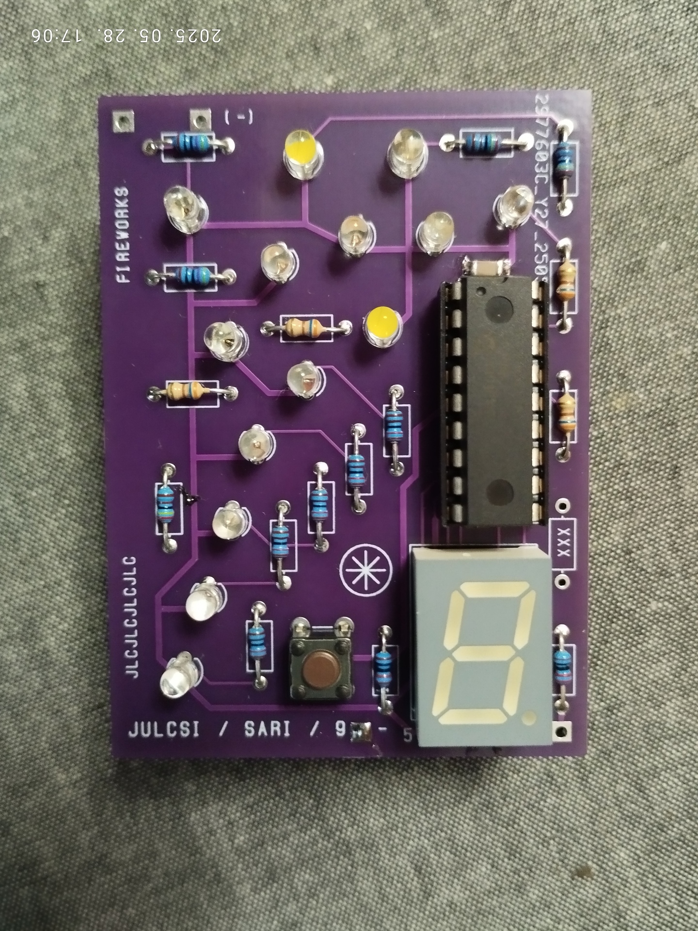 Pár éve már gyártottam egy hasonló kütyüt a nagyobbik lányunokámnak, de az hevenyészett próbapanelen készült. Hamarosan a kisebbik lányunokám lesz 9 éves, ezért neki is készítek egy mókás tűzijátékot, kicsit vállalhatóbb kivitelben. Videón látható, hogyan működik: