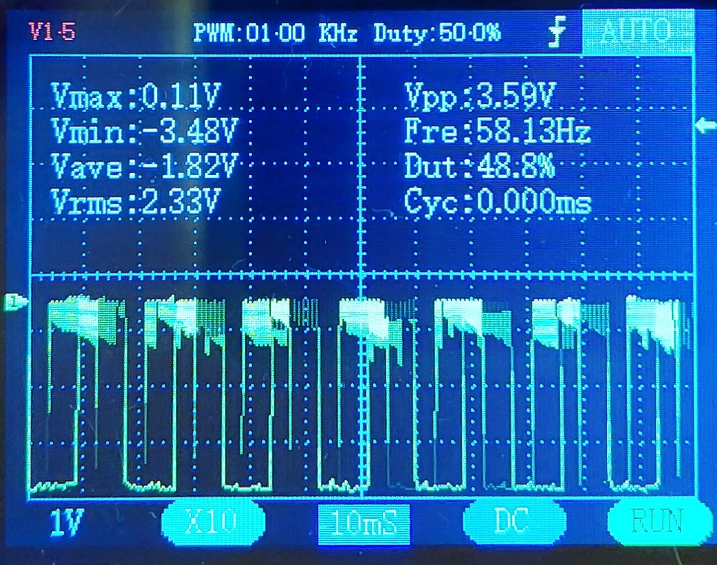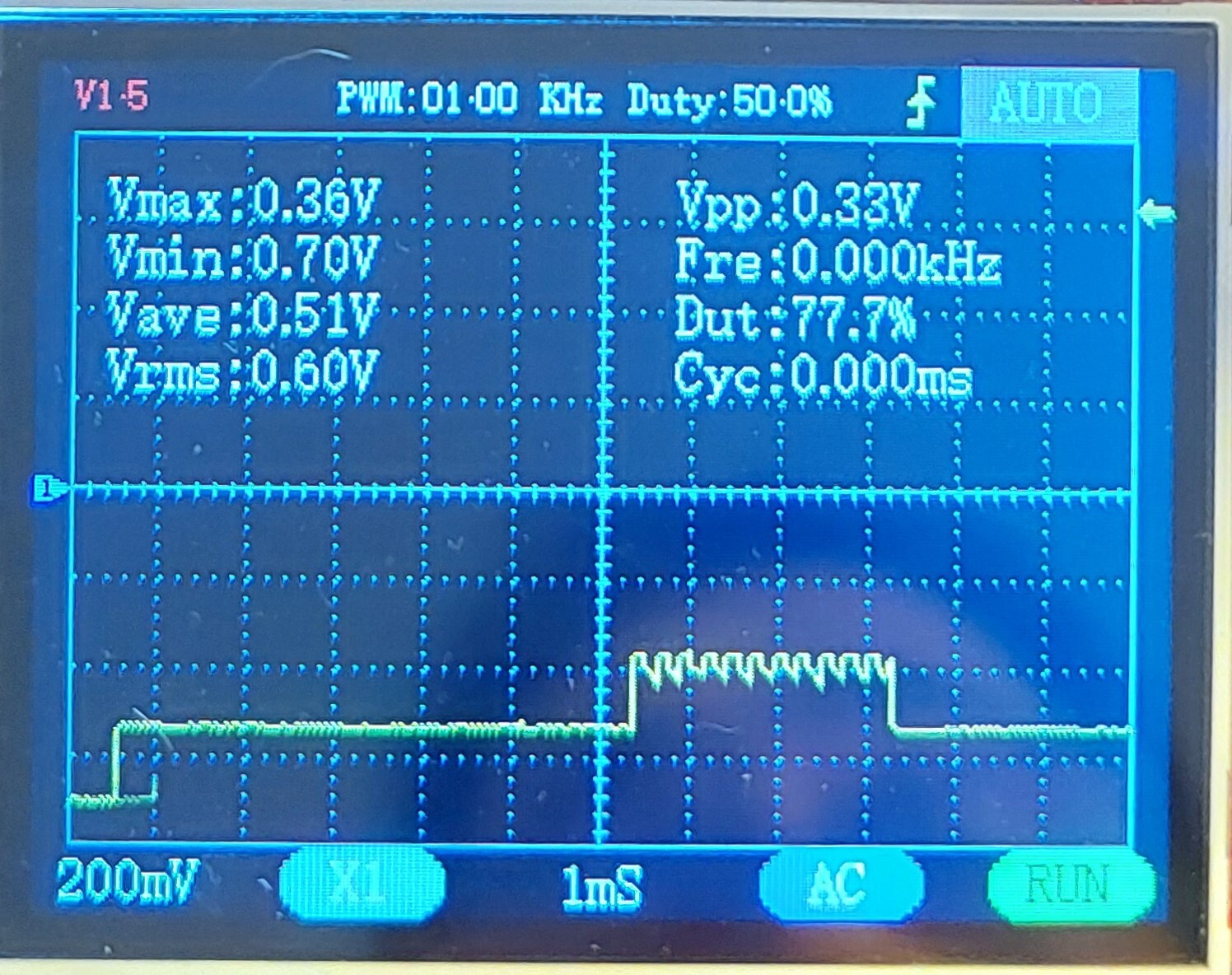 A tetején ez a "szőröződés" azért van, mert látszik a belső feszültségátalakító működése. Lévén hogy az elem 1,5V a jel meg durván a kétszerese. De az LCD-t nem érdekli, mert az lassú. (Az első képen is azért látszik "foghíjasnak a dolog, mert a tetőn lévő impulzusokkal a szkóp mintavételezése interferál. Aztán azt mutatja, amit épp "elkapott", mikor vette a mintát.) Amikor mérünk valamit, mindig kell tudni, mi is vérható. Mert a digiszkóp olyan ábrákat tud mutatni, ami a valóságban nem is létezik. Csak a drágák hasonlítanak egy analóg szkóp jeléhez, ahol jelentős túlmintavételezés van. De ha ezeket tudod, akkor tudsz boldogulni ezzel is.