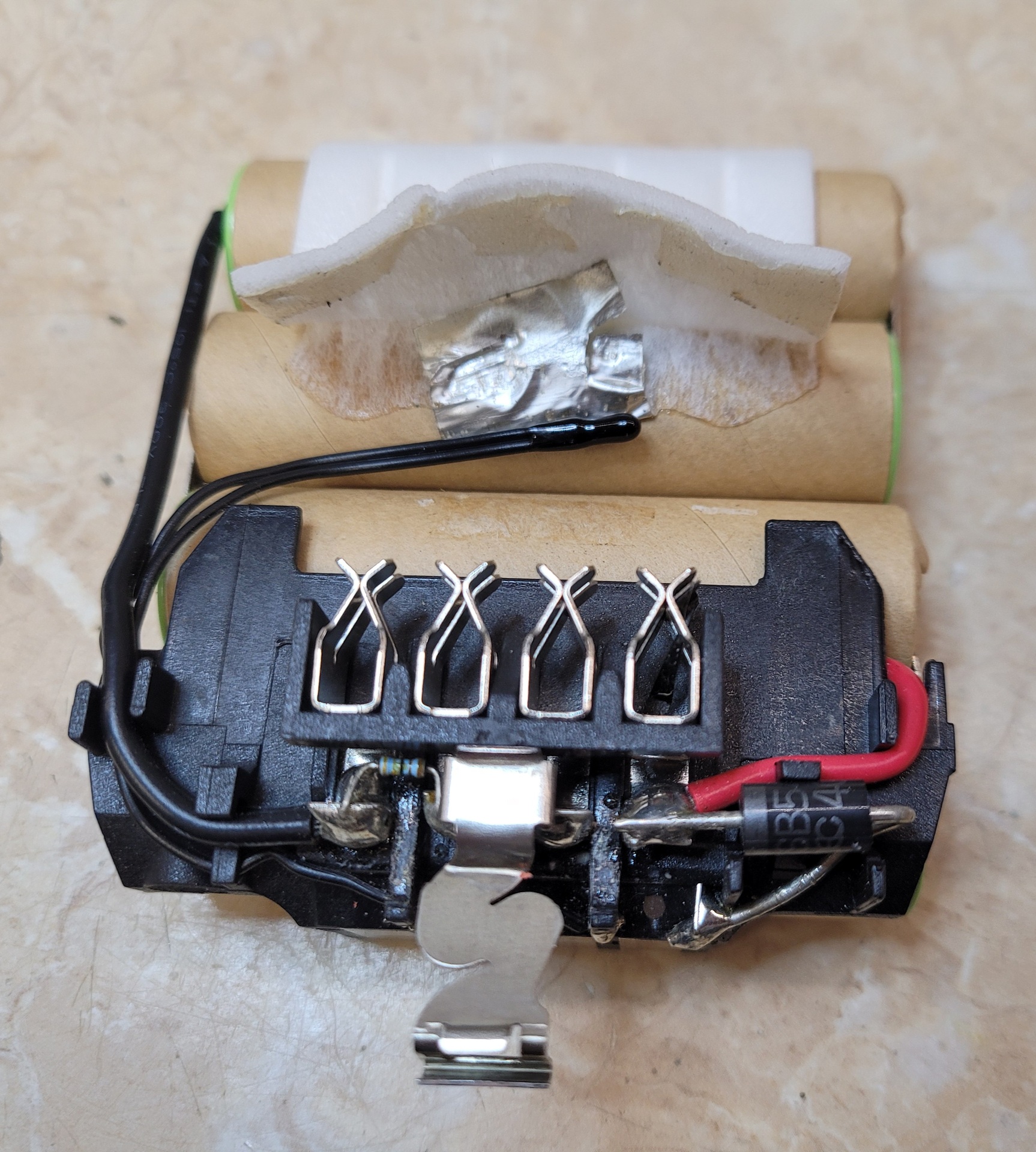 A fekete "csepp alakú" alkatrész egy termisztor lesz, az akkucsomag hőmérsékletét mérik vele.