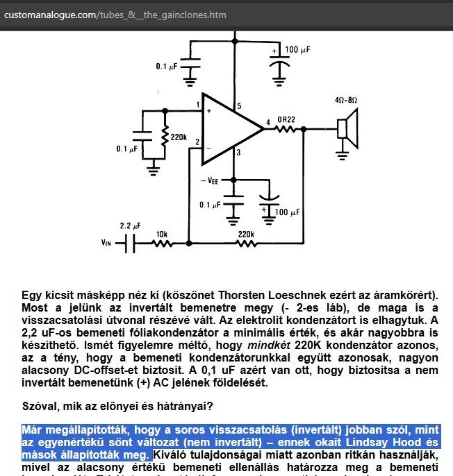 Nem mindig szólok hozzá, de feltételezem, hogy mivel sokan hallják, ti is halljátok a különbséget egy invertáló, és egy nem invertáló erősítő között (itt elsősorban nyilván visszacsatolt félvezetős erősítőről beszélek). Ennek igazából megvan a technikai magyarázata, szimulációban is kimutatható, és valós áramkörön is mérhető a különbség. Ennek ellenére azt látom, hogy "műveleti erősítő felépítésű" kapcsolásokat használtok, és hallotok jónak, amelyek neminvertáló erősítőként vannak megvalósítva (sokak szerint a "félvezetős hang" egyik oka). Ugyanakkor az interneten fellelhető, hogy az integrált megoldások közül viszonylag jónak tartott LM3886-ot is, többen próbálják neminvertáló módban használni pozitív tapasztalatokkal. Tehát még egy ilyen IC-s végfoknál is előjön ez a dolog. Nem gondolkoztál el még ezen? Ha igen, mire jutottál? (és a kérdés a többiekhez is szól) Néhányan azt is említették hogy milyen ellenállásokkal szól jobban az erősítő. Nos én azt látom, hogy van mérhető különbség amikor ellenállást cserélünk pl. a visszacsatolásban. Nincs ebben semmi misztikus, van amelyik ellenállás kevesebb torzítást visz be, és van amelyik többet. Ezt megint csak gondolatébresztőnek szántam...