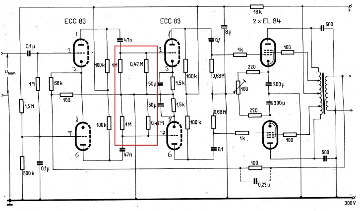 Ez szerintem konstrukciós hiba. Az 1 Megaohm az első fokozatot terhelő ellenállás, a 0,47 megaohm a következő fokozat rácslevezető ellenállása. Ez általában egy és uyganazon alkatrész szokott lenni, szerintem az 1 mega elhagyható!