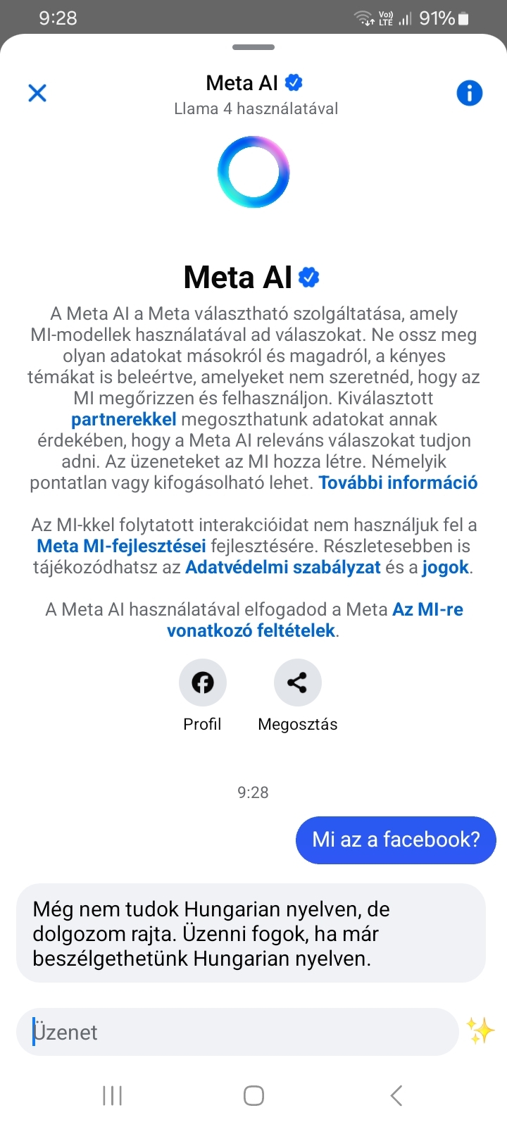 Egy ilyen nagy AI csak annyit tud magyarul, hogy nem tud magyarul. Még a ChatGPT is tud magyarul, a Meta le van maradva.