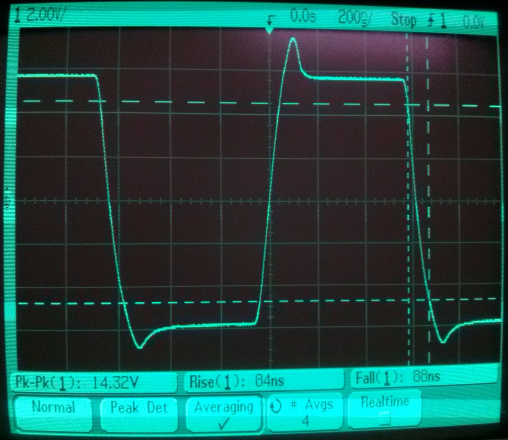 1. Tehát a szimulátor ezt mutatja a hurokerősítésre. Egyszerű másodfokú rendszer. A visszacsatolási tényező kisfrekvencián 71.4 dB és ez 1kHz-től 20dB/dekáddal csökken. 20kHz-en még mindig 46dB - a HEC kisfrekvencián tud 34-40dB-t. A fázistartartalék 83 fok és minden egyéb lényeges paraméter fel írva/rajzolva a Bode-on. 2. A gyakorlati kivitel szándékosan mek-elek stílusban. Nem biztos ám, hogy hülyeség amit mek-elek csinál - kivéve, hogy nem tud a vezetékek induktivitásáról... ami az ezüstnek is annyi, mint a réznek/vasnak. 3. A bemeneti jel CAM04251: 50 ohm generátor impedancia, 50 Ohm lezárás. A generátorom 24ns élmeredekségre van soecifikálva, annyi is, megmértem. Mire eljut a bemenetig a 40cm vezetéken, lesz belőle 31-32ns. És kicsit "berogy a négyszög" 90%-os amplitúdó fölött (de lehet, hogy a mérőcsúcs terheli be). 4. A kimeneti jel CAM4249 800 kHz-en: Azt hozza amit a szimulátor mutat. Felfutóél 41ns, lefutóél 44ns. Lehetne ebből határfrekvenciát számolgatni, de nem lenne egyszerű. 5. 6.-7. kép: Jelemelkedési sebesség. 14 Vpp-nél már kezd elfogyni a meghajtó fokozat árama. 6. Határfrekvencia CAM4257. Négyszögjellel, szemre, ezt csak "saccolni" lehet. Kb. 6MHz. Tehát a szimuláció és a mérés megegyezik. Más tanulság (most) nincs.