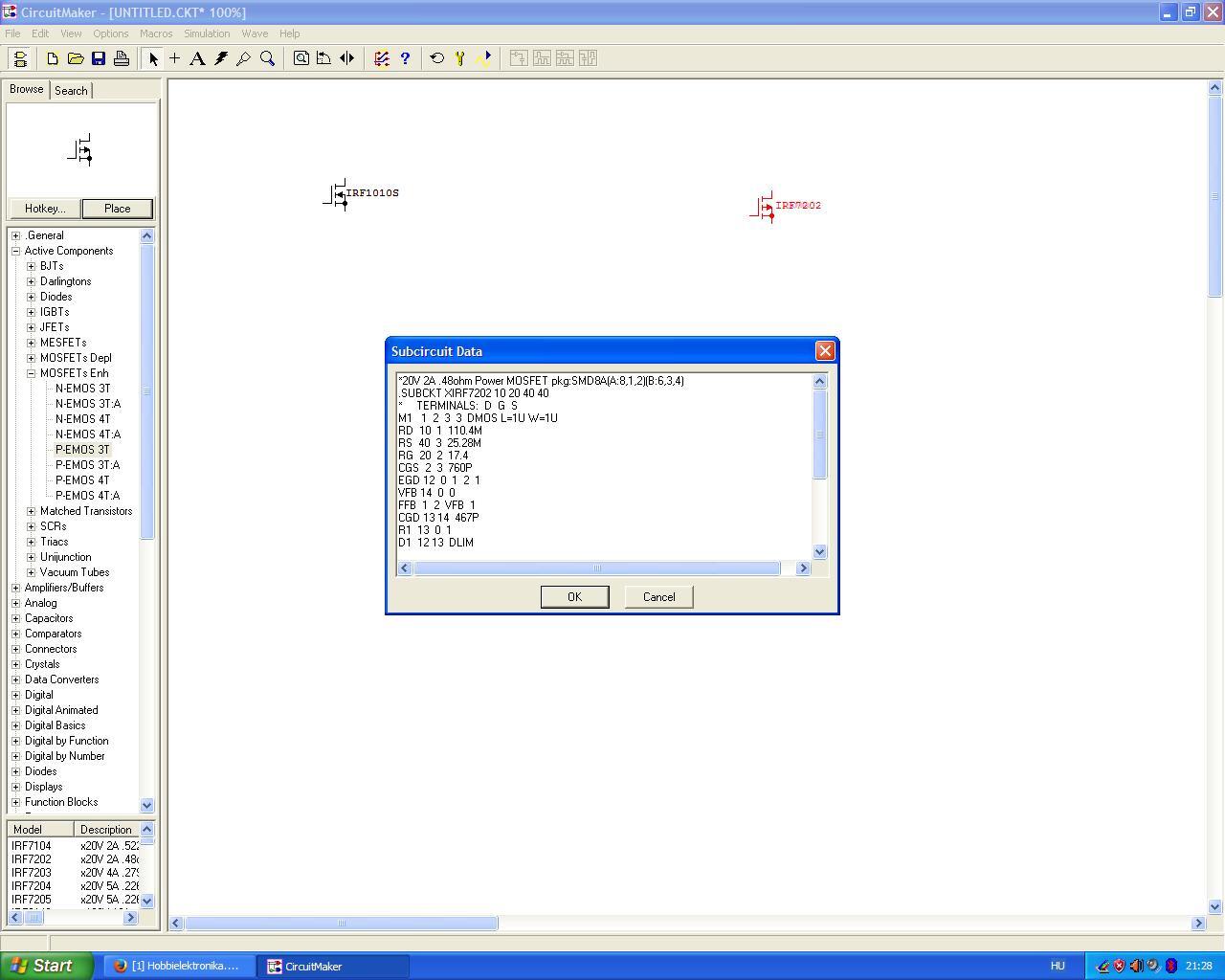 Elkezdtem beilleszteni a spice modellt. A robot azt javasolta, hogy helyezem be a spice modellt a könyvtárba. Nos, meg is találtam. Az az érdekes, hogy van *national semiconductor" könyvtár, meg "Motorola" könyvtár is. Én behelyeztem az egyikbe. Meg is jelent a programban, vagyis az IRF540 és az Irfp240 mellett ott volt a sok között a 2sk135 is. Ezt másoltam be. Csak valami még nem király, mert valamit még át kell állítani.