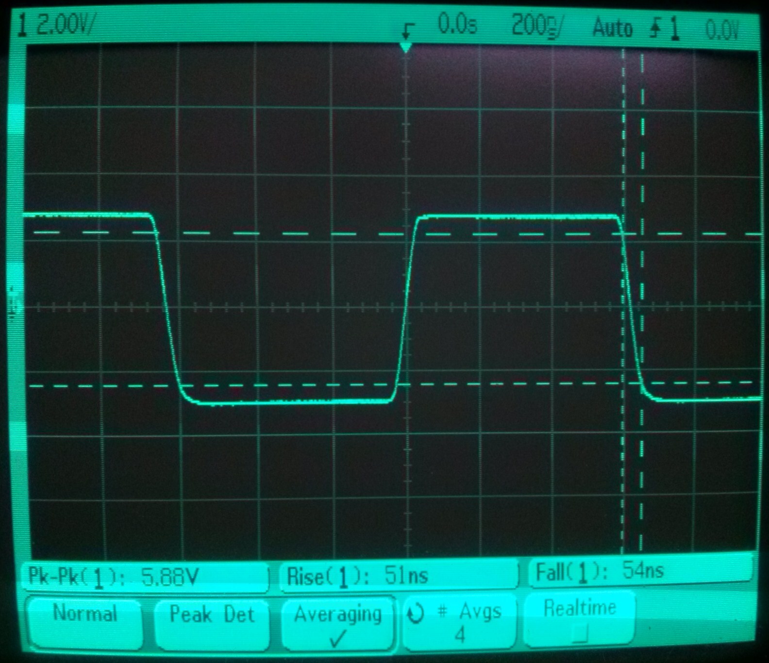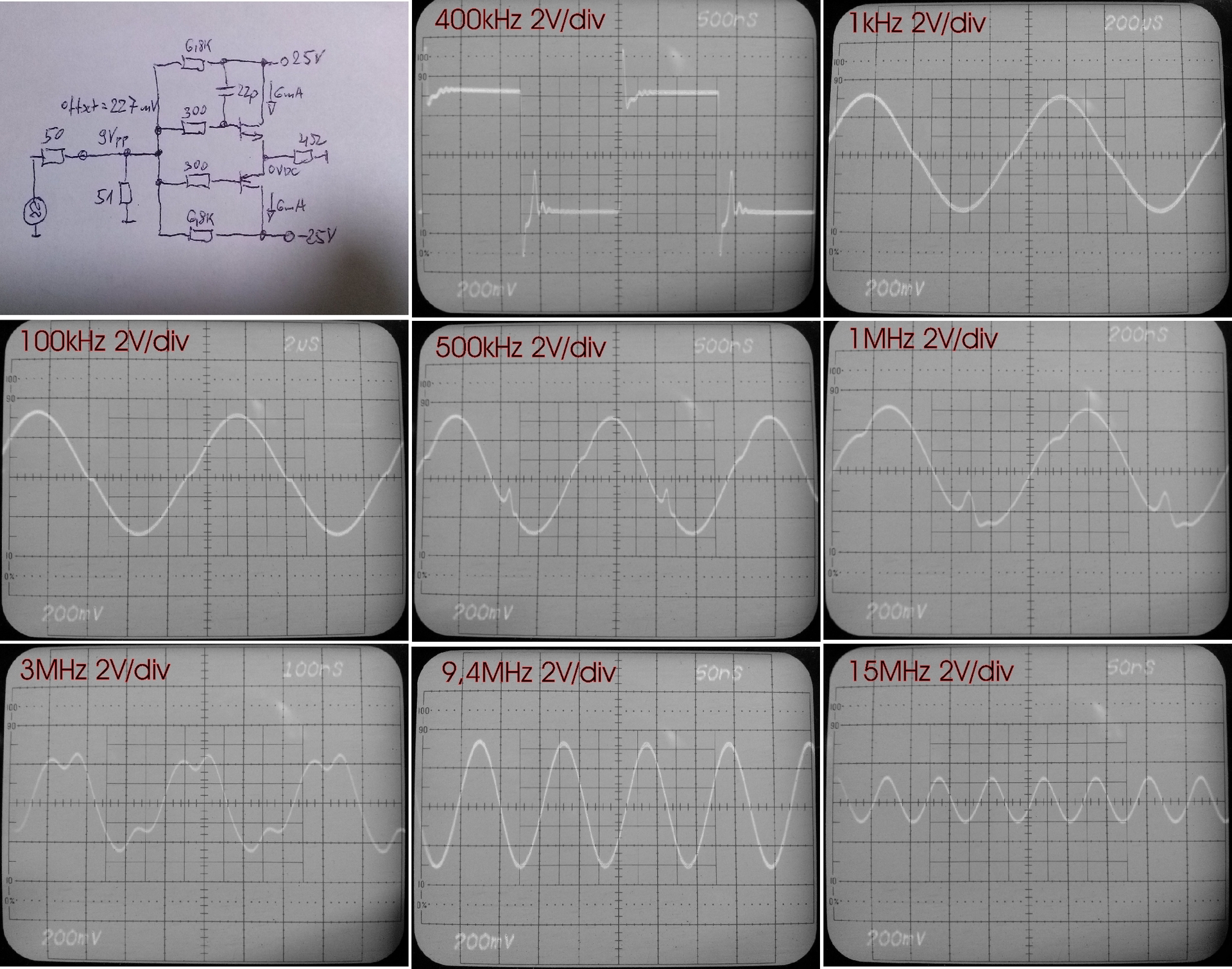 1. Tehát a szimulátor ezt mutatja a hurokerősítésre. Egyszerű másodfokú rendszer. A visszacsatolási tényező kisfrekvencián 71.4 dB és ez 1kHz-től 20dB/dekáddal csökken. 20kHz-en még mindig 46dB - a HEC kisfrekvencián tud 34-40dB-t. A fázistartartalék 83 fok és minden egyéb lényeges paraméter fel írva/rajzolva a Bode-on. 2. A gyakorlati kivitel szándékosan mek-elek stílusban. Nem biztos ám, hogy hülyeség amit mek-elek csinál - kivéve, hogy nem tud a vezetékek induktivitásáról... ami az ezüstnek is annyi, mint a réznek/vasnak. 3. A bemeneti jel CAM04251: 50 ohm generátor impedancia, 50 Ohm lezárás. A generátorom 24ns élmeredekségre van soecifikálva, annyi is, megmértem. Mire eljut a bemenetig a 40cm vezetéken, lesz belőle 31-32ns. És kicsit "berogy a négyszög" 90%-os amplitúdó fölött (de lehet, hogy a mérőcsúcs terheli be). 4. A kimeneti jel CAM4249 800 kHz-en: Azt hozza amit a szimulátor mutat. Felfutóél 41ns, lefutóél 44ns. Lehetne ebből határfrekvenciát számolgatni, de nem lenne egyszerű. 5. 6.-7. kép: Jelemelkedési sebesség. 14 Vpp-nél már kezd elfogyni a meghajtó fokozat árama. 6. Határfrekvencia CAM4257. Négyszögjellel, szemre, ezt csak "saccolni" lehet. Kb. 6MHz. Tehát a szimuláció és a mérés megegyezik. Más tanulság (most) nincs.