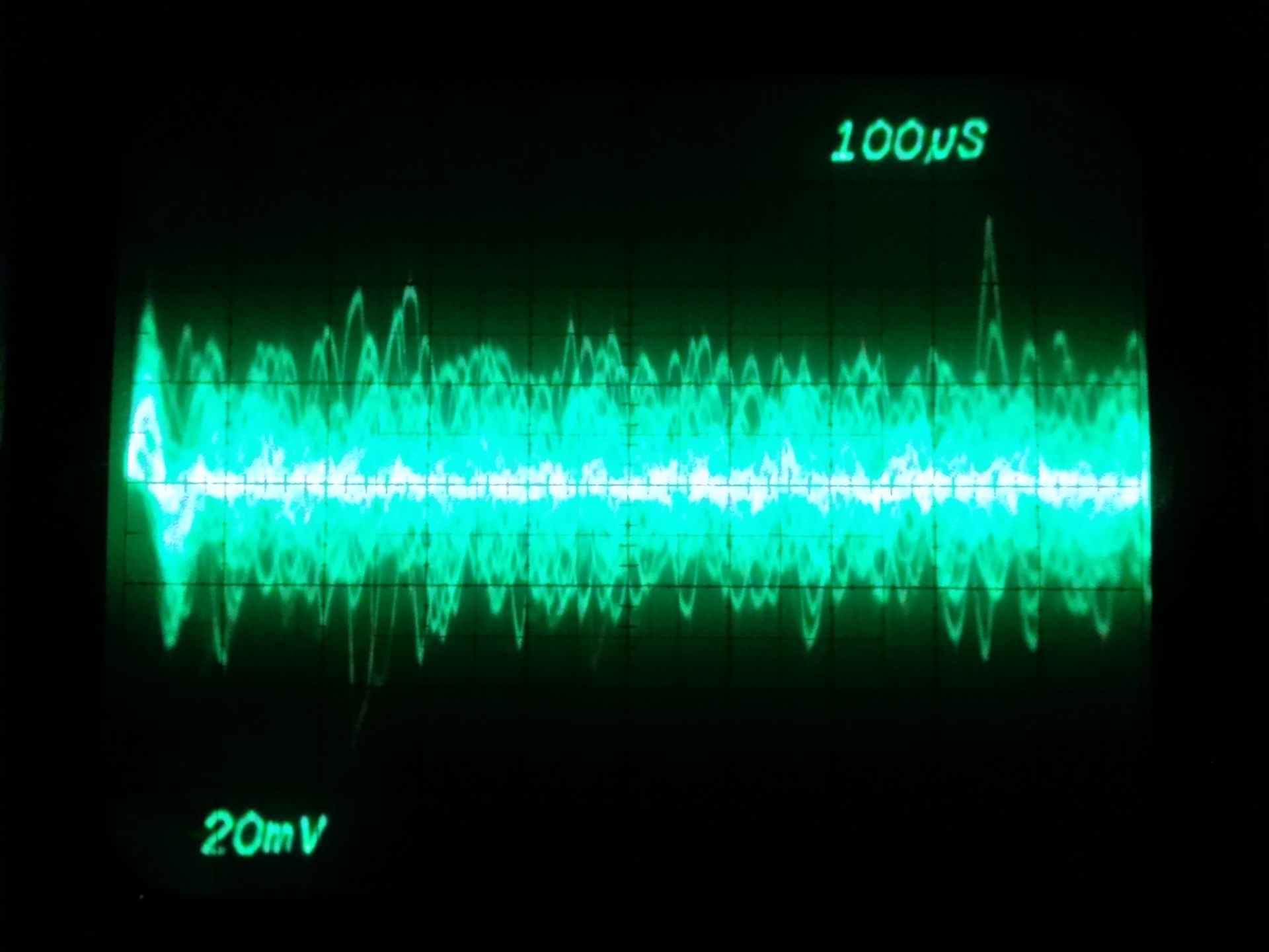 Ezen a zenén a gate áram analóg szkópon. Nem akkora katyvasz, mint amilyennek látszik: - kb. 2 kHz-ig nincs mérhető gate áram - a félhullámok periódusideje 30-50 us (10-15kHz). - a gate áram: 200mV/div / 150R = 0,4 mApp átlagosan. - shany: tehát a magas hangok szintje kicsit sem elhanyagolható a zenei jelben - a 250. és a 860. us-nél látunk egy csúnyán kiugró csúcsot ami inkább háromszögjelre emlékeztet, mint szinuszra. Na... az a tranziens torzítás. skori: Te lehet, hogy már rég túl vagy ezeken a méréseken - én még nem.