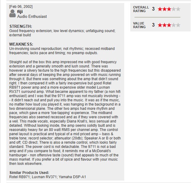 Kicsomagolás után ez az erősítő lenyűgözött a jó frekvenciaterjedésével és az általánosságban sima és telt hangzásával. Volt azonban egy ezüstös textúra a magas frekvenciákon, de ez néhány nap után eltűnt, miután az erősítőt bekapcsolva tartottuk, miközben zene szólt rajta. De volt valami az erősítővel, ami nem hangzott jól. Ezután összehasonlítottam egy viszonylag olcsó, de jó Rotel RB971 végfokkal és egy drágább, régebbi modellű Luxman RV371 surround erősítővel. Ami nyilvánvalóvá vált apámnak (egy nem hifi-rajongónak) és nekem, az az volt, hogy a 9711 erősítő zeneileg nem volt magával ragadó -- nem nyúlt ki, és nem húzott be a zenébe. Olyan volt, mintha a zene, bármilyen hangosan is játszottad, a háttérben lógott volna egy kétdimenziós síkban. A másik két erősítőnek nagyobb volt a ritmusa és a tempója, ami inkább "lábujjkopogós" élményt nyújtott. A középfrekvenciák is visszahúzottnak tűntek, mintha fátyol borította volna őket. Ez az éneket, különösen Diana Krall éneket, kevésbé érzékivé és részletessé tette. Anélkül, hogy belenéznénk, az erősítő masszív felépítésűnek tűnik, és egy 80 wattos RMS csatornánkénti erősítőhöz képest meglehetősen nehéz. A kezelőpanel elrendezése praktikus és tipikus egy középkategóriás erősítőre – basszus és magas hangok; felvételválasztó; csillapító (20db); A vagy B hangszóró vagy mindkettő és kikapcsolva; CD direkt. Van egy távirányító is, ami meglehetősen szabványosnak tűnik. A tápkábel nem levehető. A 9711 nem rossz erősítő, és ha az ételhez hasonlítjuk, egy McDonald's hamburgerre emlékeztet – nem tolakodó íz (hangzás), ami a tömegpiac nagy részének tetszik. Ha egy kis fűszerre és aromára vágysz a zenédben, akkor keress máshol.