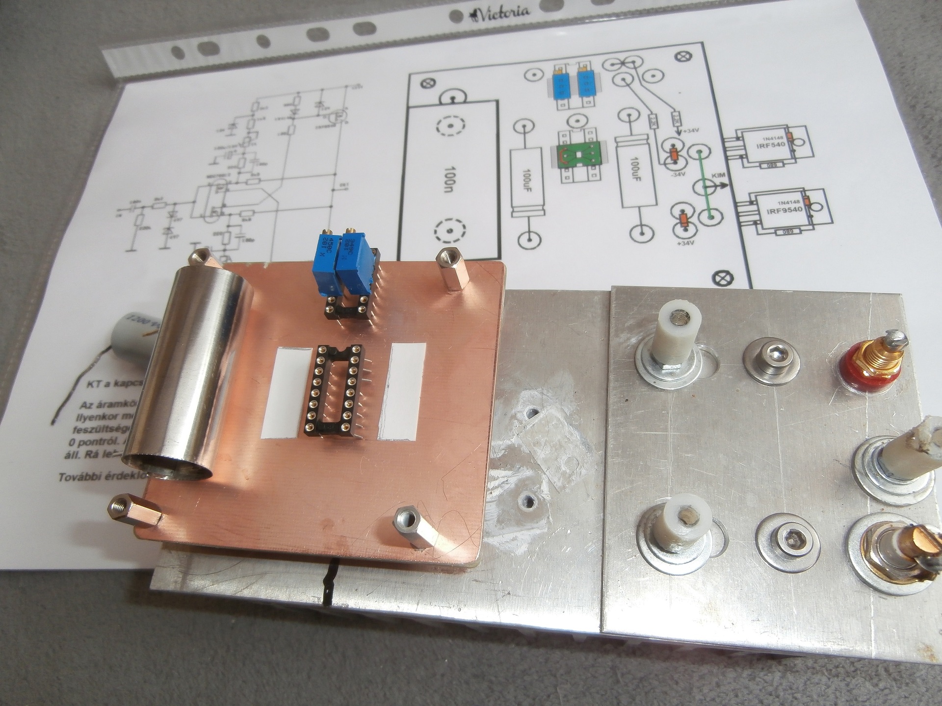 A fiam végre segített a duál FET beforrasztásban. Neki jobb a szeme (meg más is). Szóval lendületet vett a dolog. Azonban a foglalatba forrasztáshoz használt munkapad elveszett, így újat kellett gyorsan csinálnom. Hátra van a védelem felszerelése, és a beállítások. Vf3 deszkamodellDiszkrét alkatrészekkel megépített Vf3 mosfet végfok tesztelési célból.