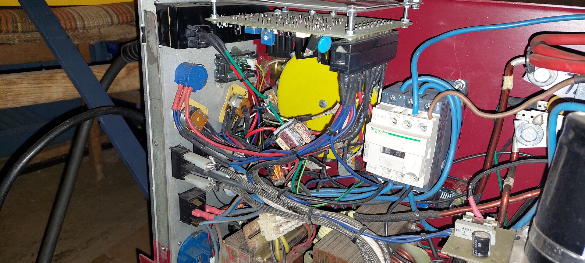 Egy 130Amperes kis hegesztőből építettem ezt a gépet. Mindent rátettem, amit lehetett. A kondenzátorokat sem akartam kihagyni.