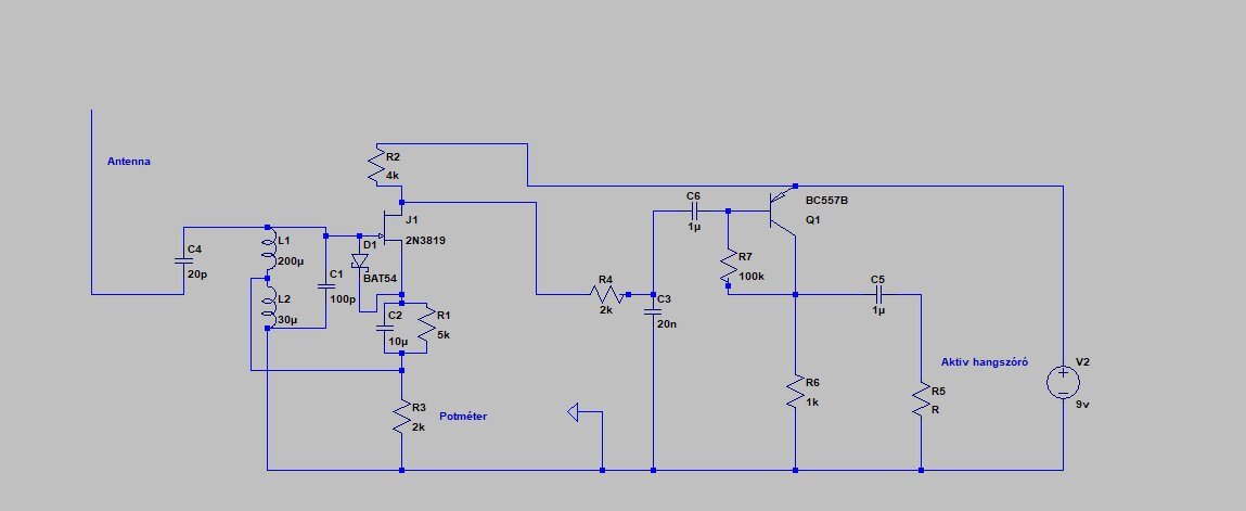 rajzoltam le ezeket. Ezért tartok tőle, pontatlanságok, esetleg lényegi hibák is lehetnek a rajzokon. 2. rajz: Ezt a jfetes regeneratív vevőt Barefoot (ha jól emlékszem) Very simple regen kapcsolásából alakítottam ki. A transzformátort elhagytam, ellenállással helyettesítettem, és a fet lábáról csatoltam ki a jelet, amit alul áteresztő szűrő után erősítettem. Ez talán a legjobb a négy közül. A tekercs ferrit rúdon volt, de két gyári induktivitással is ment. A dfc 77-et is tudtam vele fogni. A schottky dióda elhagyható.