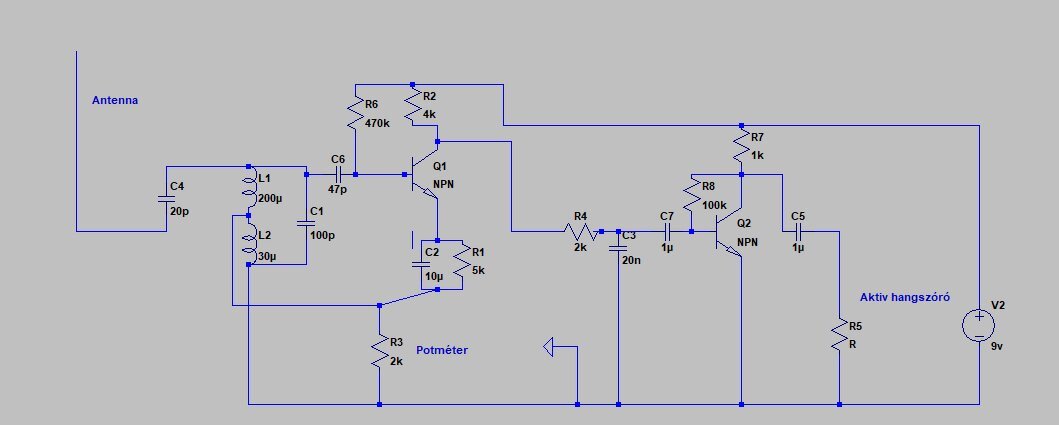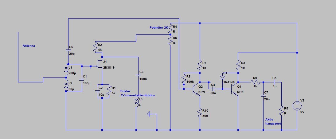 Ez nem regeneratív vevő, hanem egy egyenesvevő q sokszorozóval. A rezgőkörre az antenna egy leágazáson át csatlakozik. Az jfetes q sokszorozó jfet-je közvetlenül rá van kötve. Az energia a tekercs ferritrúdjára egy tickleren keresztül (Armstrong) jut vissza, ami 2-3 menet közvetlenül a ferritre van rátekerve, merevebb drótból. A potméterrel a Q1 jfet tápfeszültségét szabályozzuk, ezáltal erősítését is. Q2 az egyenesvevő rész RF erősítője, Q3 a D1 diódával az AM detektor. A D1 dióda nem tudom, nem fordítva kell e. A hozzászólás módosítva: Okt 29, 2025