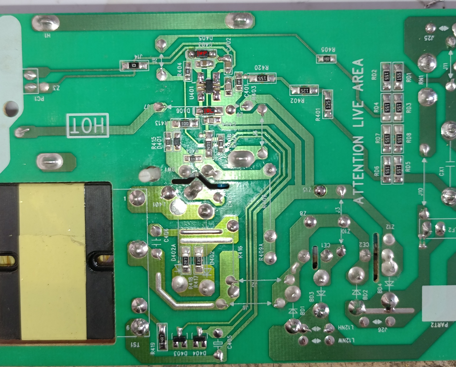 A segédtáp a D404-C405-ből alakul ki ( lent ). 230 V nélkül visszafelé megtáplálva ezt a kört is, le lehet ellenőrizni egészen az 1. lábig.
