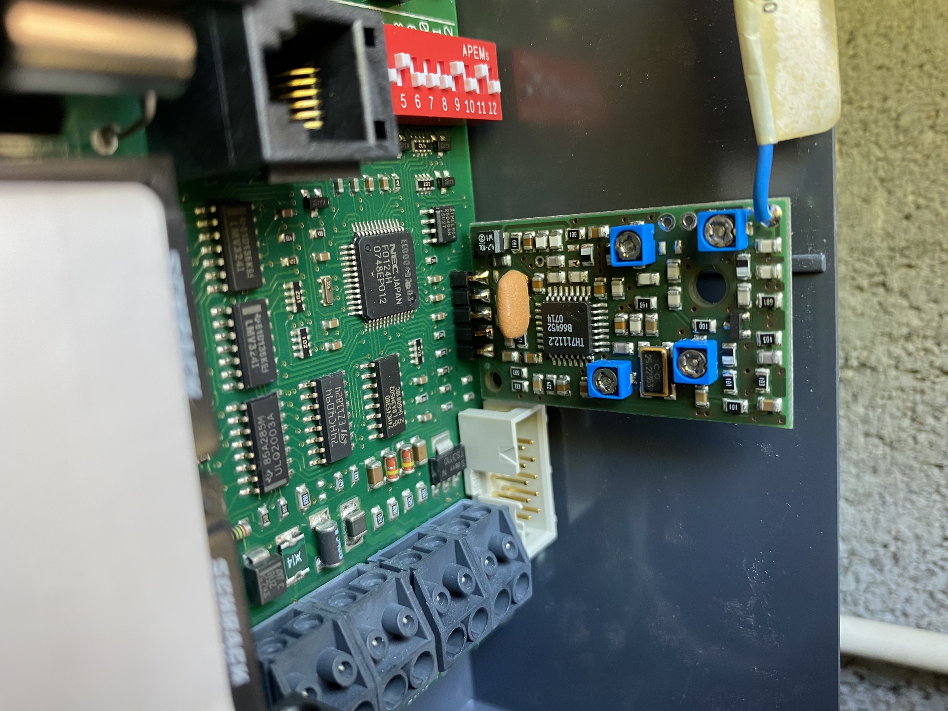 Megoldódni látszik a probléma. Amin elsiklottam a hibafelvételezésnél: A perifériák stabil 12V-ról mennek, amit egy tranzisztoros stabilizátor állít elő. Már visszakövettem a jelet a proci lábáig. A 8k2-t kicseréltem egy potira, és sikerült a Kalex által írt 3 féle állapotot elkülöníteni. Szakadt kör, zárlatos kör és jól működő kör.(8k2 a bemeneten). Az tűnt fel, hogy a 24V-os trafómat a leválasztóról tápláltam, amiben van egy 60W-os izzó a kimenettel sorban, kapcsolhatóan. Ha benne volt a körben, akkor a proci lábán 3V körüli érték volt mérhető. Ez pont ott van, ahol a proci átbillen, és hibának veszi. Lefele olyan 1.5V a billenéshatár. Mivel a rossz 12V-os stab miatt a kimenő 12V hol 14V hol meg csak 13.8 V volt, a bemenet sem volt stabil. Ez meg billegtette nekem a procit ide oda. A stabilizátor egy TO220as tranyó, mellette 2 SMD ellenállás és 2 kis kondi. Az egyik ellenállás (8201 felirattal) voot szakadt. Azt kicserélve beállt a kimenet 12V-ra,ami független a hálózat ingadozásától. Üdv! István