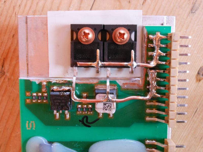 TIG AC/DC 200PSziasztok!Hozzájutottam egy kínai univerzális hegesztőhöz ami nem hajlandó semmilyen módban működni. Valószínűleg sohasem működött gyárilag rossz volt a belsejéből ítélve, pormentes, füst nyomok nincsenek. KB fel lelhető hozzá a legfontosabb kapcsolások, már pár órát ültem rajta de nem tudok dűlőre jutni. Sajnos már páran próbálták meg javítani de valószínűleg sikertelenül. A fő tápot valószínűleg sikerült helyre állítani a kimenetin a feszültség meg van, minden beállításra reagál, viszont a kimeneti végfok nem hajlandó működni. Jelenleg a nagy áramú rész szét van választva és 40V- labortápról próbálgatom az kimenti invertet, a hegesztő bekapcsolva van csak le van húzva a magas feszültségű csatija a tranzisztorokról. Jel vezetékek össze vannak kötve. DC módban mintha jól működne, a szabályzó panelról meg érkezik a DC jel, a kimeneten meg jelenik szépen a 40V DC, terhelésként rá van akasztva egy 220V/100W izzó és parázslik az izzó szál. Viszont AC módban csak fél periódus van jelen. A vezérlő panelról megérkezik a ellentétes jel az OPTO-k ra, a kitöltés is szépen változik ha tekergetem. Ha lehúzom a FET-eket akkor mindegyik kimeneten meg van a négyszög jel szépen. Külön külön próbáltam a FET csoportokat úgy tűnik működnek. Itt viszont elfogyott a tudásom. Nem teljesen értem valójában hogyan is kellene eben az esetben működni a teljes hídnak ilyen formában és meghajtással. Ahogy próbálgattam lekapcsolgatni a FET csoportokat úgy vettem észre hogy ami DC üzemben működő fet csoport AC-ban nem hajlandó. A kapcsolások közül az én gépem valahol a 2-ő között van. Az AC/DC inverter része az az első pdf Van-e öltetettek hogyan induljak tovább? Előre is köszönöm a segítséget. Gys 3200 szekunder oldali dióda csereSziasztok. Szert tettem egy Gys 3200 inverteres hegesztő gépre. Szemre a panel jó állapotú azaz még nem nyúltak hozzá. Viszont elsőre a szekunder oldali diódák zárlatosak. Elsőre nem tűnik bonyolult hibának annak aki jártas elektronikák, főleg smi-k forrasztásában. DE vegyétek figyelembe, hogy én azért elég balek ( vagy balfácán?) eme témában ellenben kellően bátor, hogy elsőre lehetetlennek tűnő feladatnak is neki ugorjak. Amit kérdeznék: kinek milyen technikai javaslata lenne a diódák cseréjére figyelembe véve a korlátozott adottságaimmal. A neten szétnézve elsőre találtam egy megoldást ( a mellékelt fényképeken látható) de ez még nekem is bizarrnak tűnik. Kiforrasztani az smi egész sor leceit nem akarom ill. valószínűleg elcseszném. Valami darabolásos technikára gondolok de jó lenne egy két ötletelés hátha megtetszik és úgy érezném, hogy sikerre tudnám vinni. Ugyan van több inverteres hegesztő gépem de mind nagyobb és úgy döntöttem szeretnék egy ilyen kis súlyú működő hegesztő gépet is birtokolni. Szóval csak bátran engedjétek szabadjára a fantáziátokat ha örömmel teszitek.