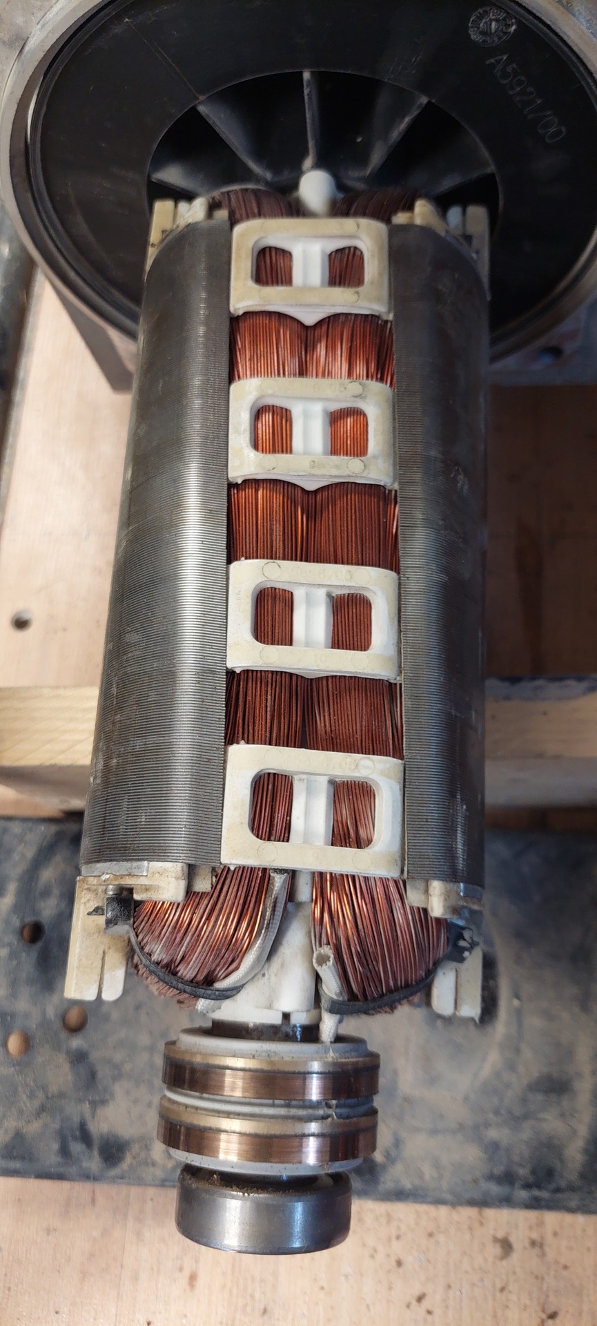 A forgórészt a főtengelyre egy húzócsavar és egy MK4 kúp rögzíti így azt levenni macerásabb, a szénkefék kivétele után inkább a külső rész óvatos lehúzását javaslom, aztán már látható is a forgórész, amiben látni fogod a mágnesek gyári helyét.