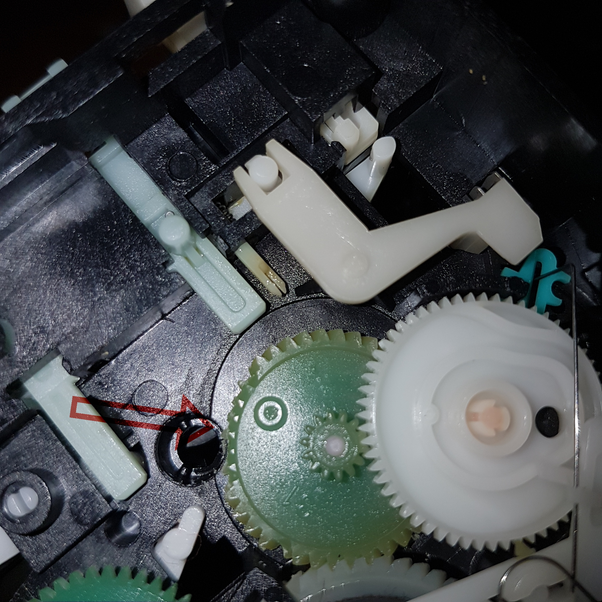 [Később...] Az aljából kivettem a csavarokat és levettem a tetejét. Levettem a számláló szíját, kivettem a gombsort és kifordítottam a helyéről a mechanikát. Mivel még mindig nem látszott semmi, ezért kivettem a nagy lendkereket is. Az eredmény a képen látható, piros nyíllal jelölve: ebből az egyetlen fogaskerékből hiányzik egy marék fog!!