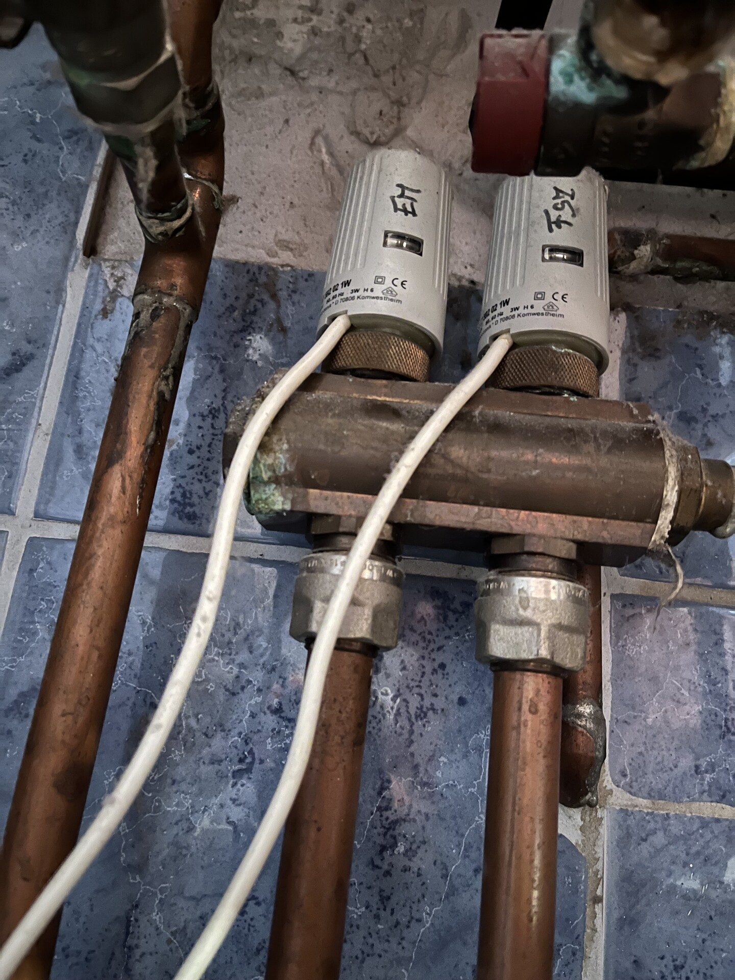 Szerintem (a képek alapján) azzal a két zónaszeleppel van kettéosztva a ház fűtése (emelet és földszint). Az "Fsz" zónaszelep ha nem nyit ki akkor a földszinten nem lesz fűtés. Először ezt kellene leellenőrizni, hogy az a motor működik e. Ha szükséges le kell venni az osztóról.