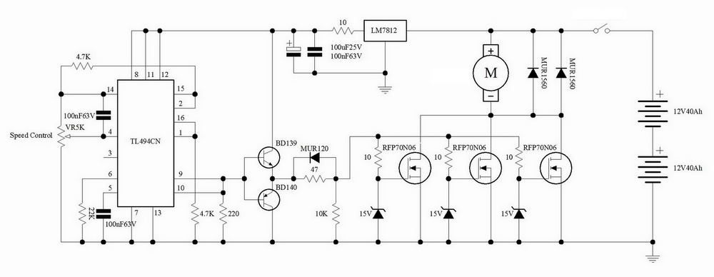 Én 4,7-5,1Ohm. ot szoktak sorba kötni, csak amikor üzem közben 60fokot eléri,ill.fölé megy a tranzisztor, és/vagy Fet ,hőmérséklete.. szabályos színuszos jel látható a kollektor körben, 10,5V- táp.fesz.ről, a meghajtó Ic. 555'ös, 8V-ról müködik. stabil 18,2KHz, továbbá ez az alapjel, 556'os Ic.kapcsolással, 40Hz~ moduláló jellel is, szépen dolgozik.. ez utóbbi kapcsolható egyébként. DC motor lágyindításSziasztok!Van egy elektromos gyerek kis traktorunk, 2 db 12V 165W -os DC motor hajtja. Ehhez szeretnék lágyindítást. Fordulatszám szabályozás nem szükséges. Tudnátok ajánlani egy minél egyszerűbb kapcsolást? Köszi szépen! Tl494 pwm motor szabályzásSziasztok!Lenne egy kérdésem felétek! Megépítettem a mellékelt tl494 kapcsolást, ami működik, viszont a 12voltos stabkocka másodpercek alatt tűz forró! Már a sokadik kapcsolással járok így, nem értem ,hogy mi vesz fell akkora áramot , hogy pillanatok alatt 80-100c fok! Esetleg találkozott valaki hasonlóval, vagy életképes ez a kapcsolás? Működik a szabályzás , és bitang erős is, leszámítva ,hogy 5 másodpercen belül le kell kapcsoljam a tápról ,külömben felrobbana a stabilizátor! Minden segítséget előre köszönök! További szép estét!