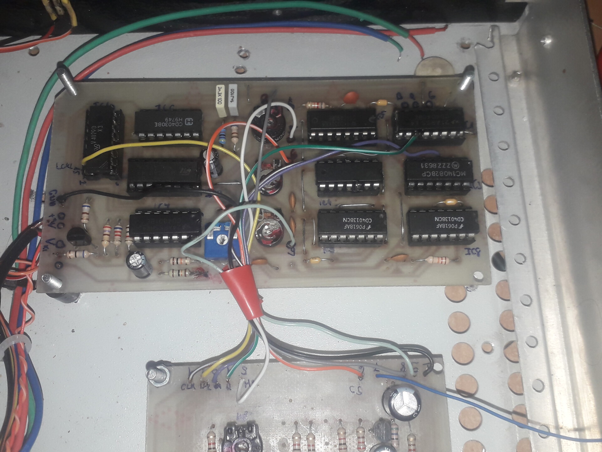 Egy másik pont is van amit nem értek. Az IC5-re megy a CBLK jel. Ami a PCB_.jpg képen a lila 1.-es sorszámú. Ide biztosan be kell kötni a CBLK-át. Mert így jut el D1 tároló IC8 D1 tároló bemenetére. Igen ám! De hogy megy el a jel CD4030-as VAGY kapuhoz? Még ha a a képen a lila 2-es pontra is kötöm a CBLK jelet, akkor sem oda fog menni.