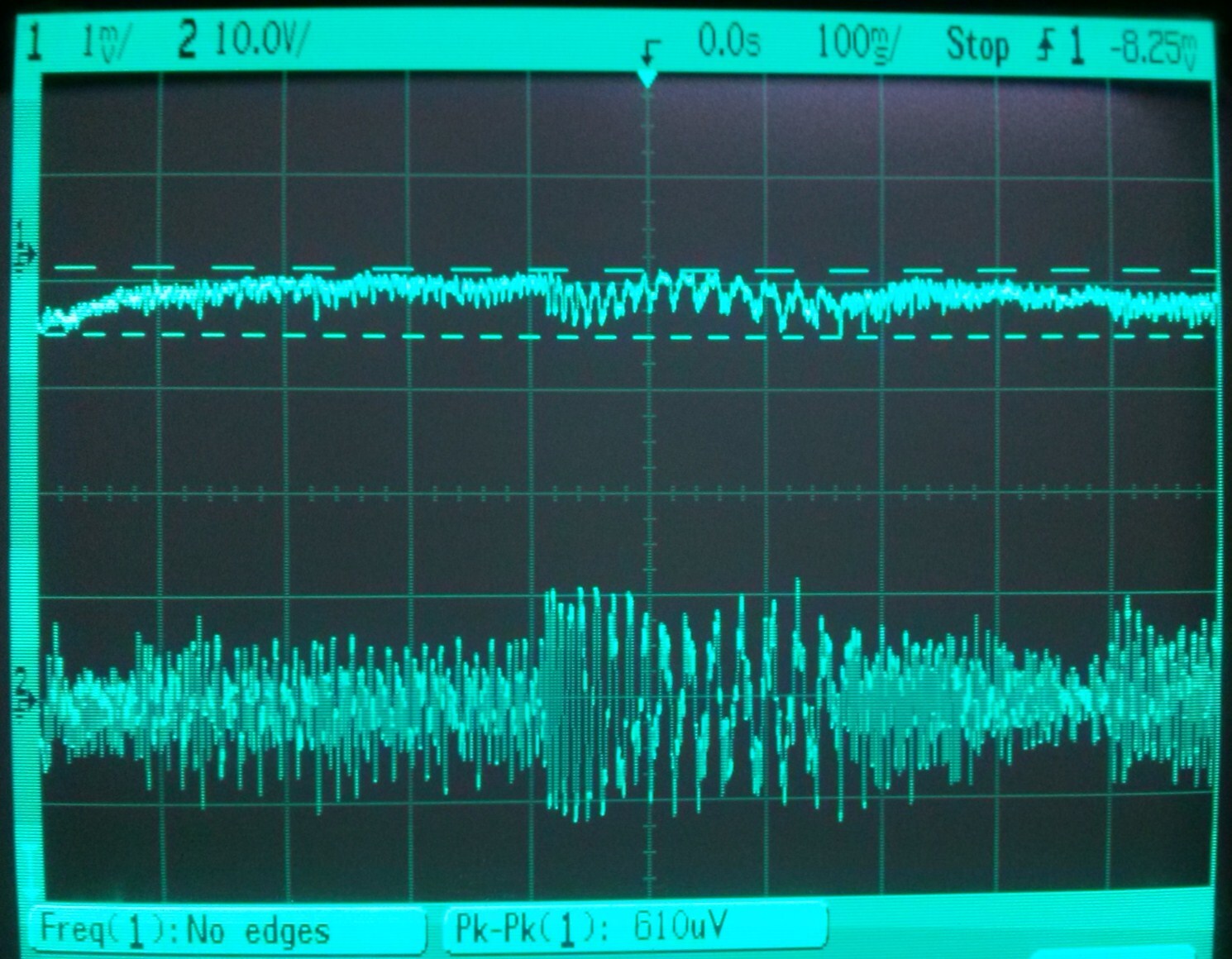 - Négyszöggel mérve látható néhány mV-nyi tüske a stab kimenetén, de nincs semmi berezgés a kimeneti jelen és ez a fontosabb.